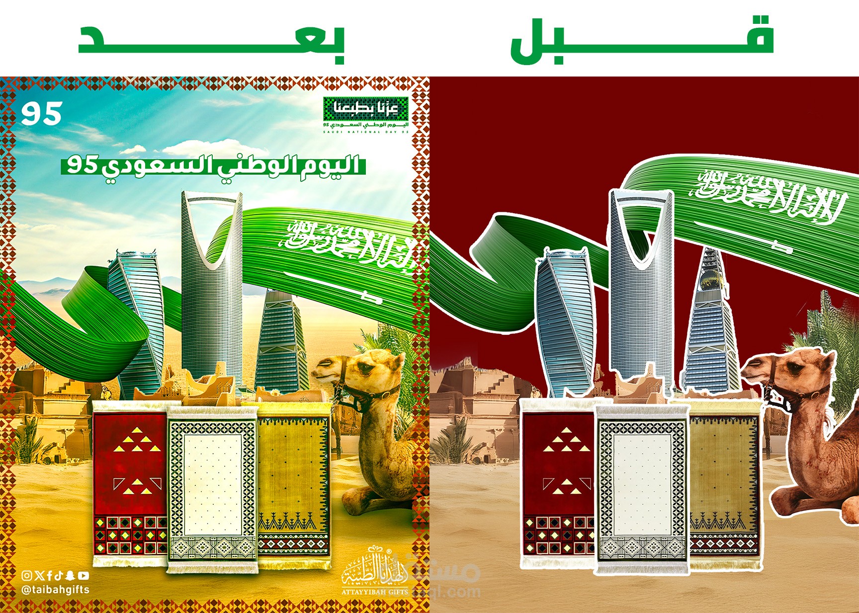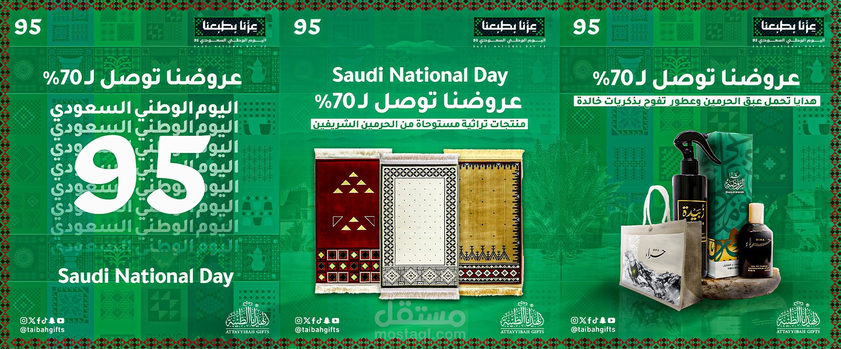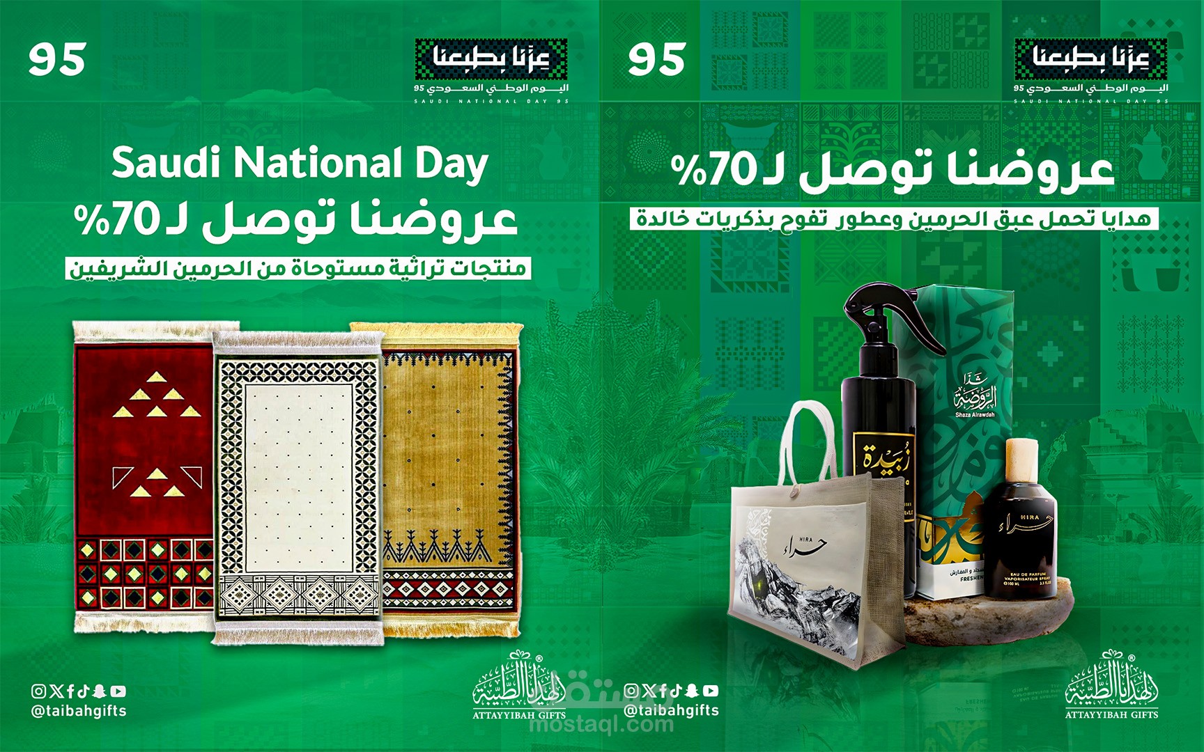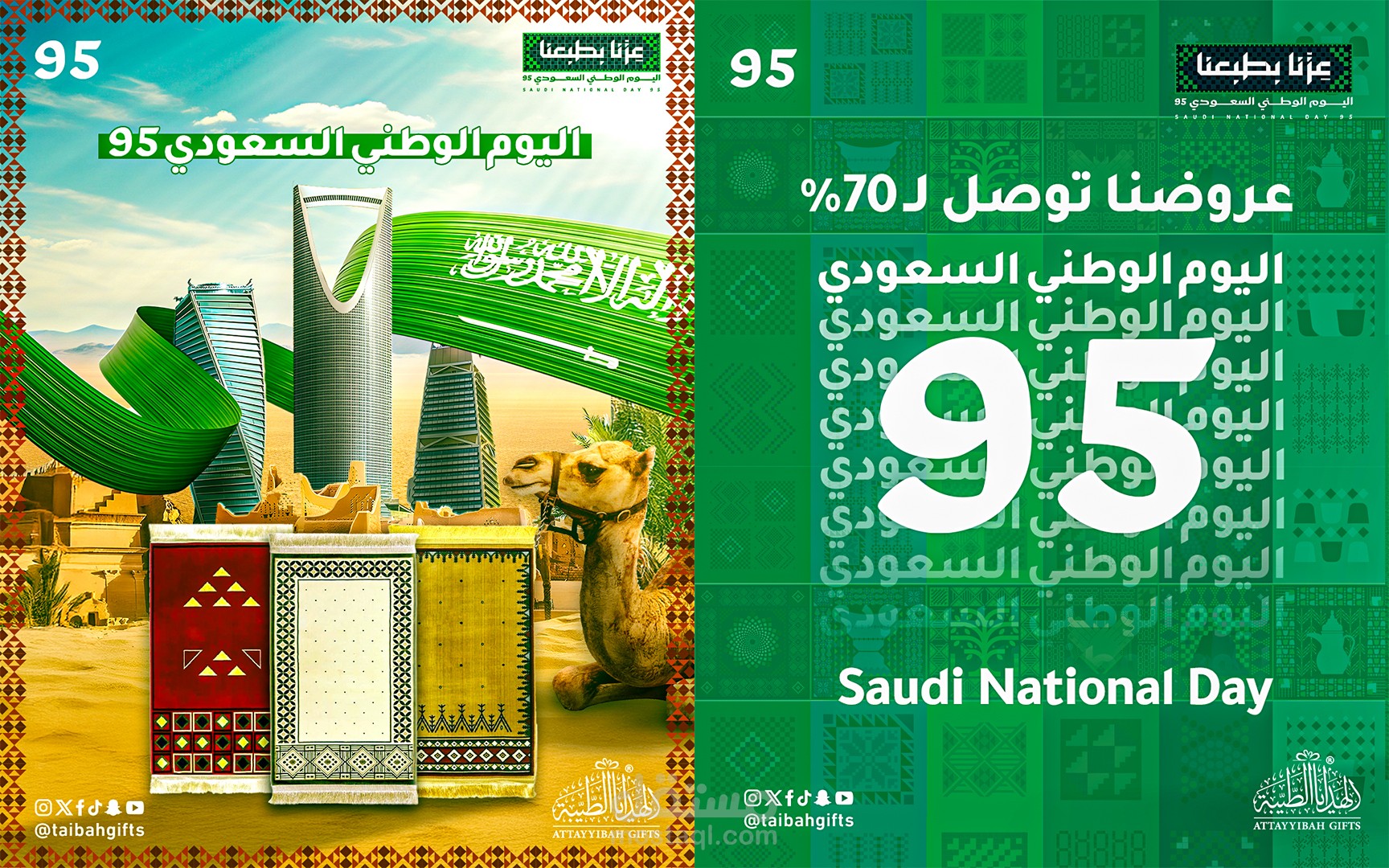 مشروع إعلاني خاص باليوم الوطني السعودي 95، ركزت فيه على إبراز الهوية الوطنية من خلال الألوان (الأخضر والأبيض) والعناصر البصرية المستوحاة من الثقافة السعودية.