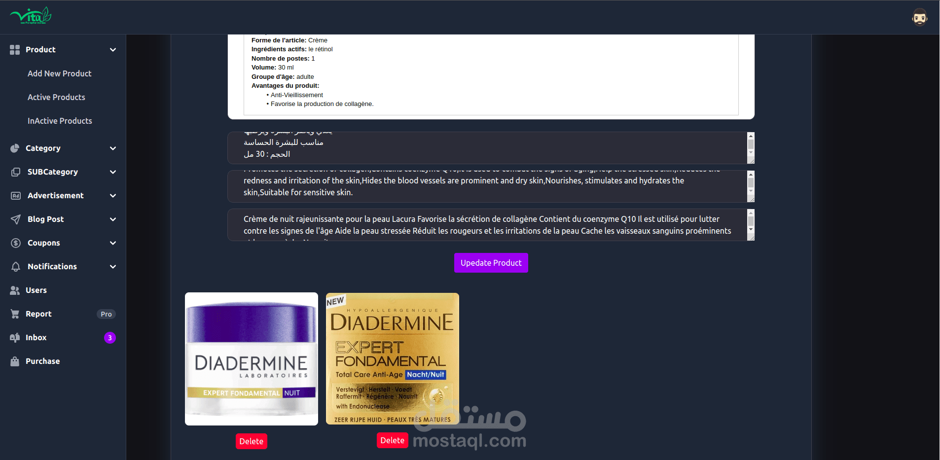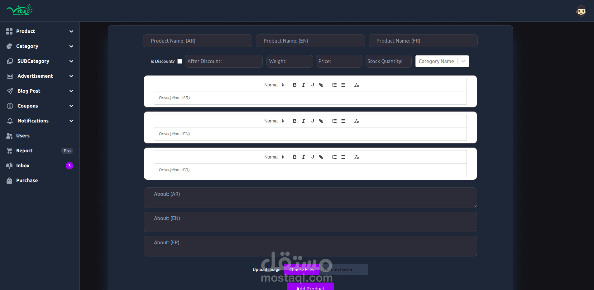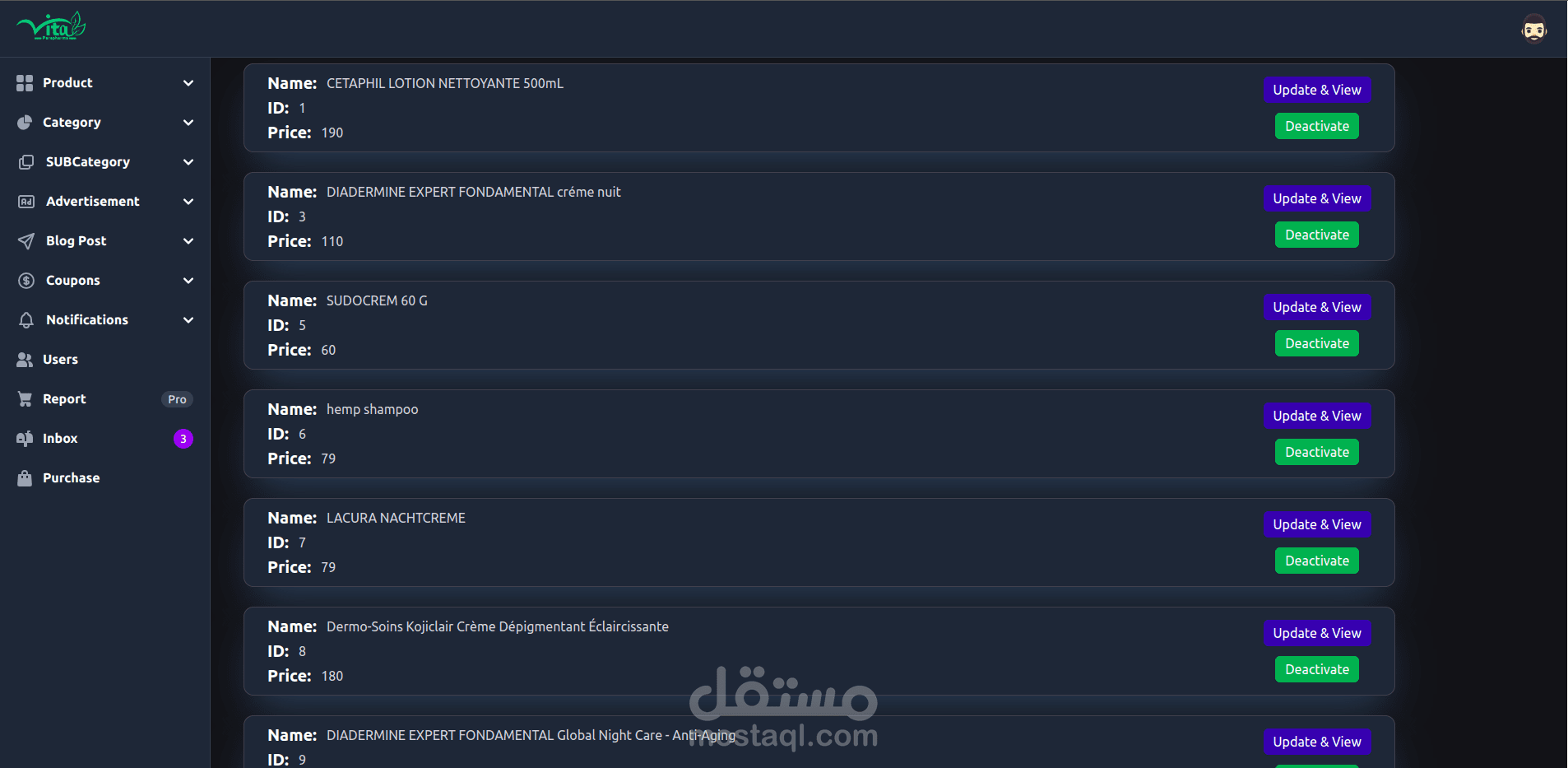 Vitaparapharma Admin Dashboard for Vitaparapharma Website, https://www.vitaparapharm... , it’s a system for pharmacy with multi languages , Manage all aspects of your e-commerce platform with ease. This admin dashboard controls products, categories, notifications, users, blogs, ads, and reports
