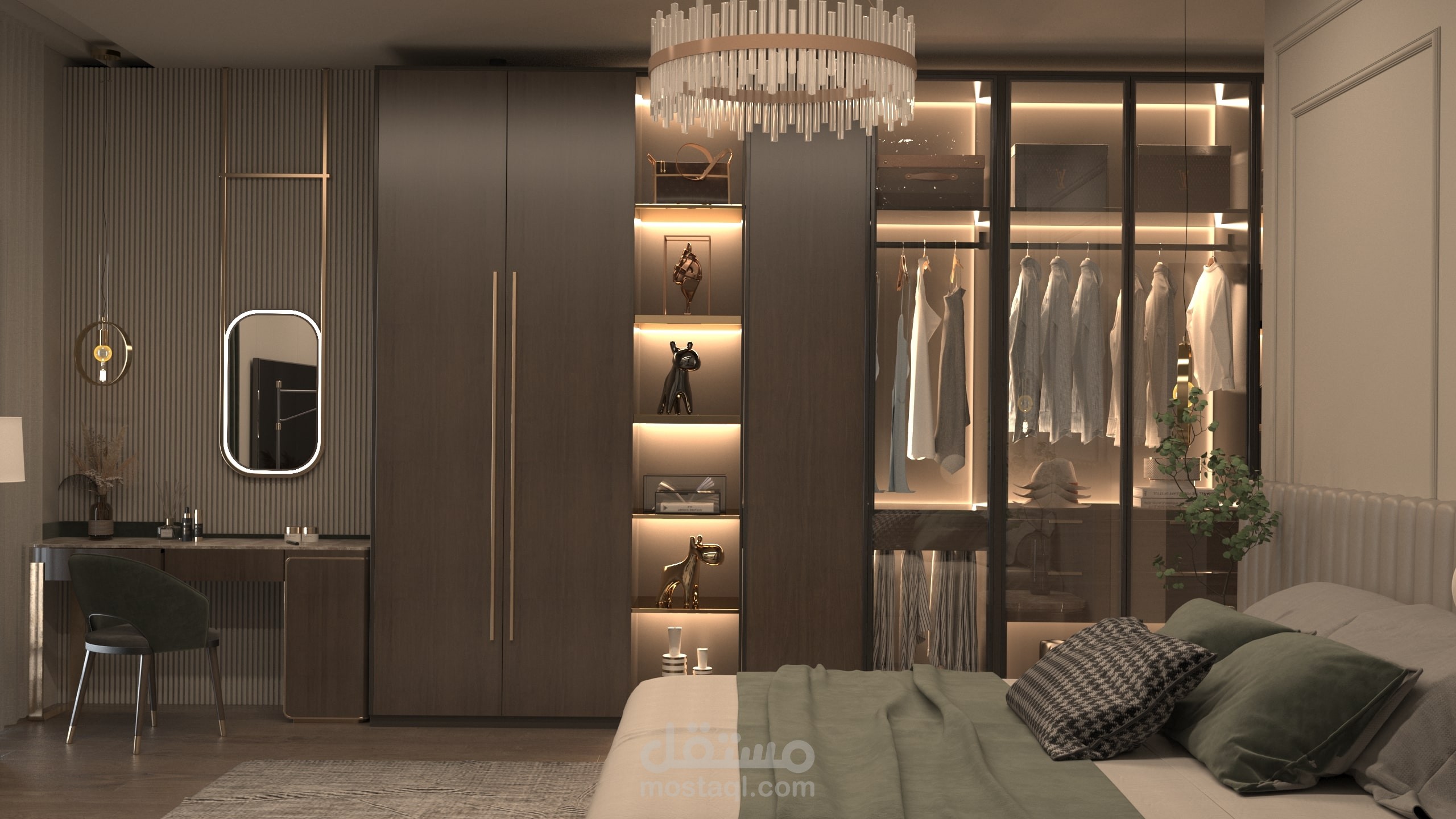 وبالتالي، تمكنا من خلق غرفة نوم رائعة تجمع بين الفخامة والعملية بشكل مثالي، وتمثل بأسلوبها الفريد جوًا هادئًا ومريحًا للسكن، مما أسهم في تحقيق رضا العميل واستمتاعه بمساحته الجديدة."