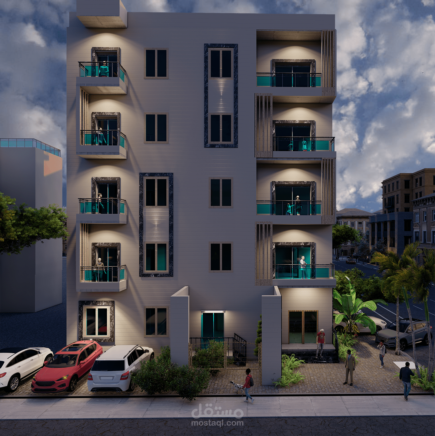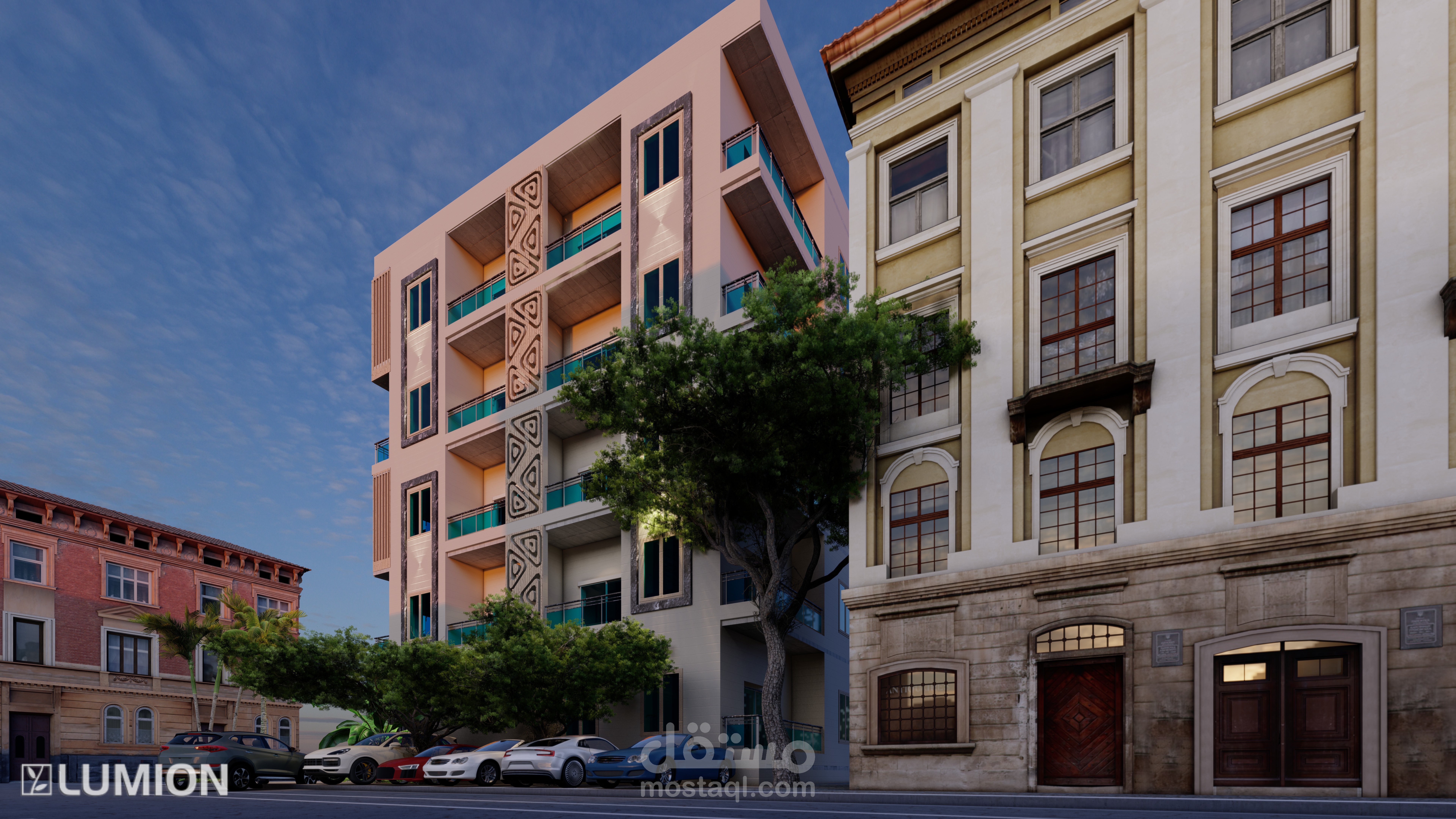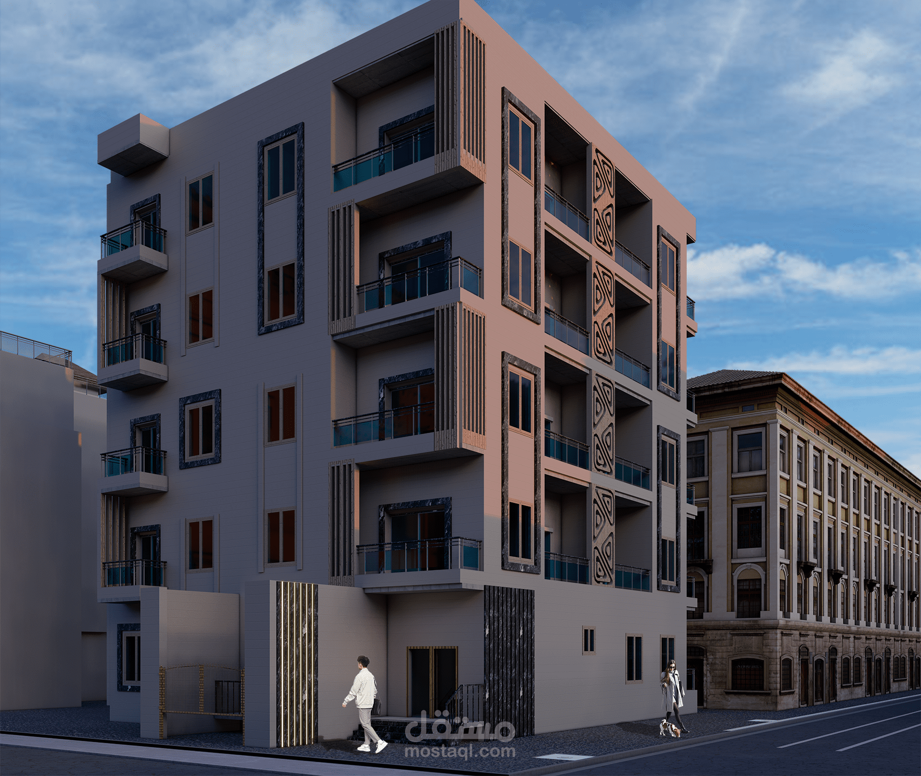 تم تصميم بنايه سكنيه ب التجمع الخامس 5 ادوار طوابق كل طابق يحتوي علي عدد 2 شقه بمساحه 156 متر مربع صافي مساحه داخليه