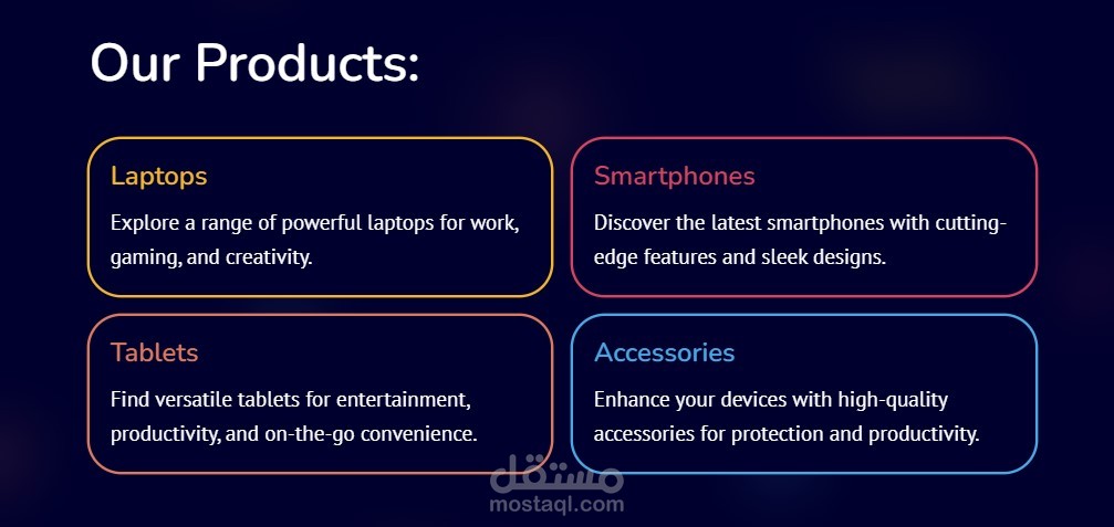 مجموعة واسعة من المنتجات: يقدم المتجر مجموعة واسعة من المنتجات من العلامات التجارية الرائدة، بما في ذلك الهواتف الذكية، وأجهزة الكمبيوتر اللوحية، وأجهزة الكمبيوتر المحمولة، والساعات الذكية، وأجهزة التلفزيون، وأجهزة الصوت، وأجهزة المطبخ، وغيرها الكثير.