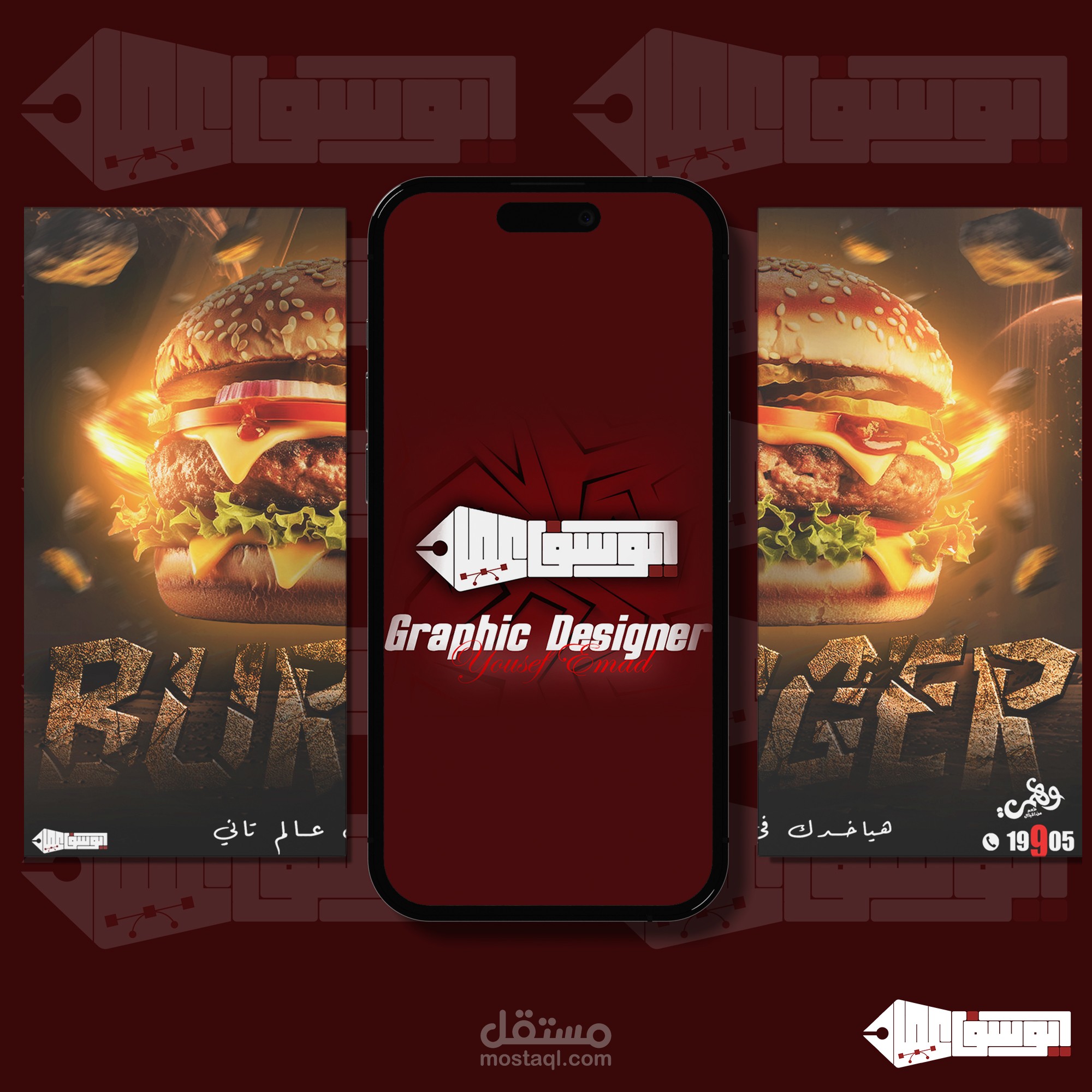 تصميم إعلاني تجريبي لمنتج برجر، تم تنفيذه بهدف عرض المهارة في تصميم الحملات التسويقية لمنصات التواصل الاجتماعي. ركزت في التصميم على إبراز المنتج بطريقة جذابة باستخدام الإضاءة وتوزيع الألوان، مع لمسة واقعية تسويقية.