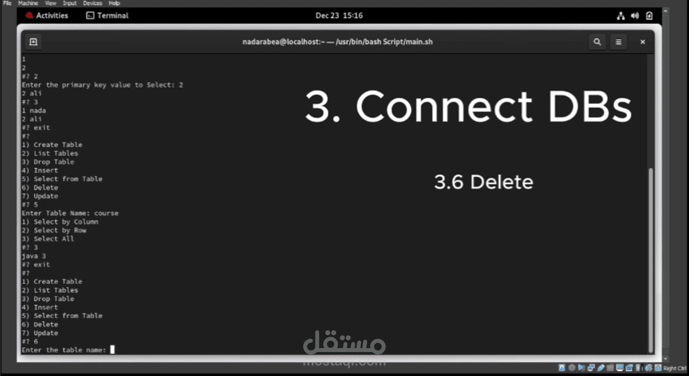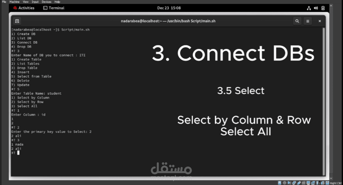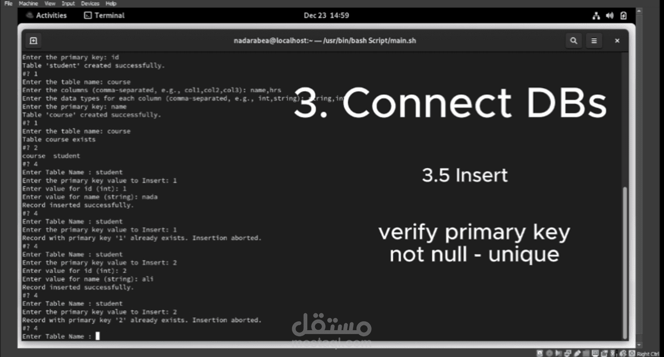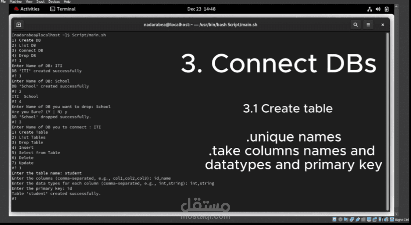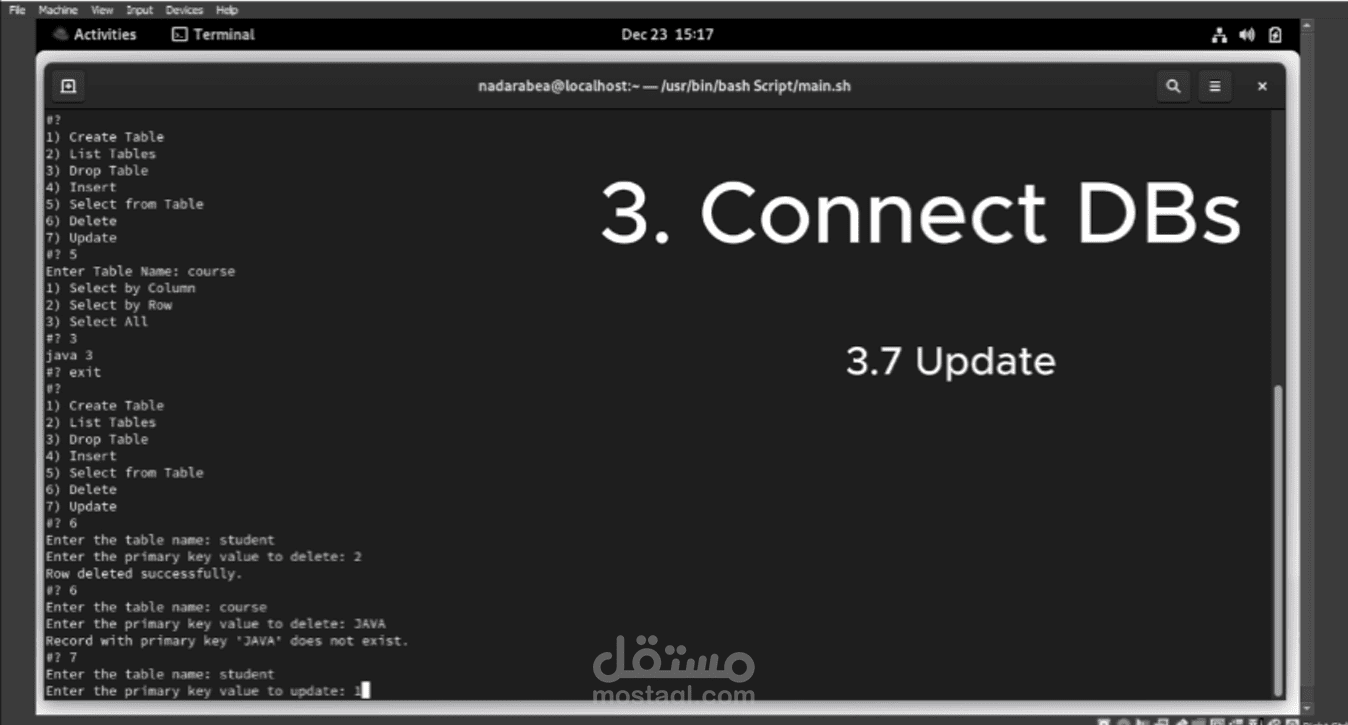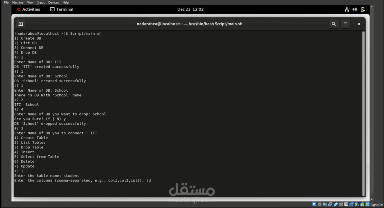 قمت بتصميم نظام إدارة قواعد البيانات باستخدام سكريبت Bash Shell. يتضمن هذا النظام واجهة سطر الأوامر التفاعلية التي تمكن المستخدم من إدارة قواعد البيانات بطريقة بسيطة ومباشرة. تم تصميم قائمة الواجهة لتشمل مجموعة من الخيارات مثل إنشاء وحذف وتحديث الجداول، وإضافة وحذف البيانات، وتنفيذ الاستعلامات، وعرض بنية الجداول. يتيح هذا النظام للمستخدمين إدارة قواعد البيانات الخاصة بهم بسهولة وفعالية من خلال واجهة سهلة الاستخدام.