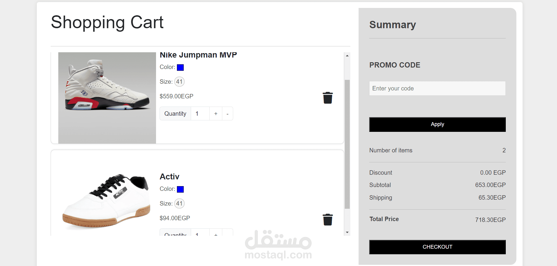 Users can adjust quantity, choose color and size for each item.