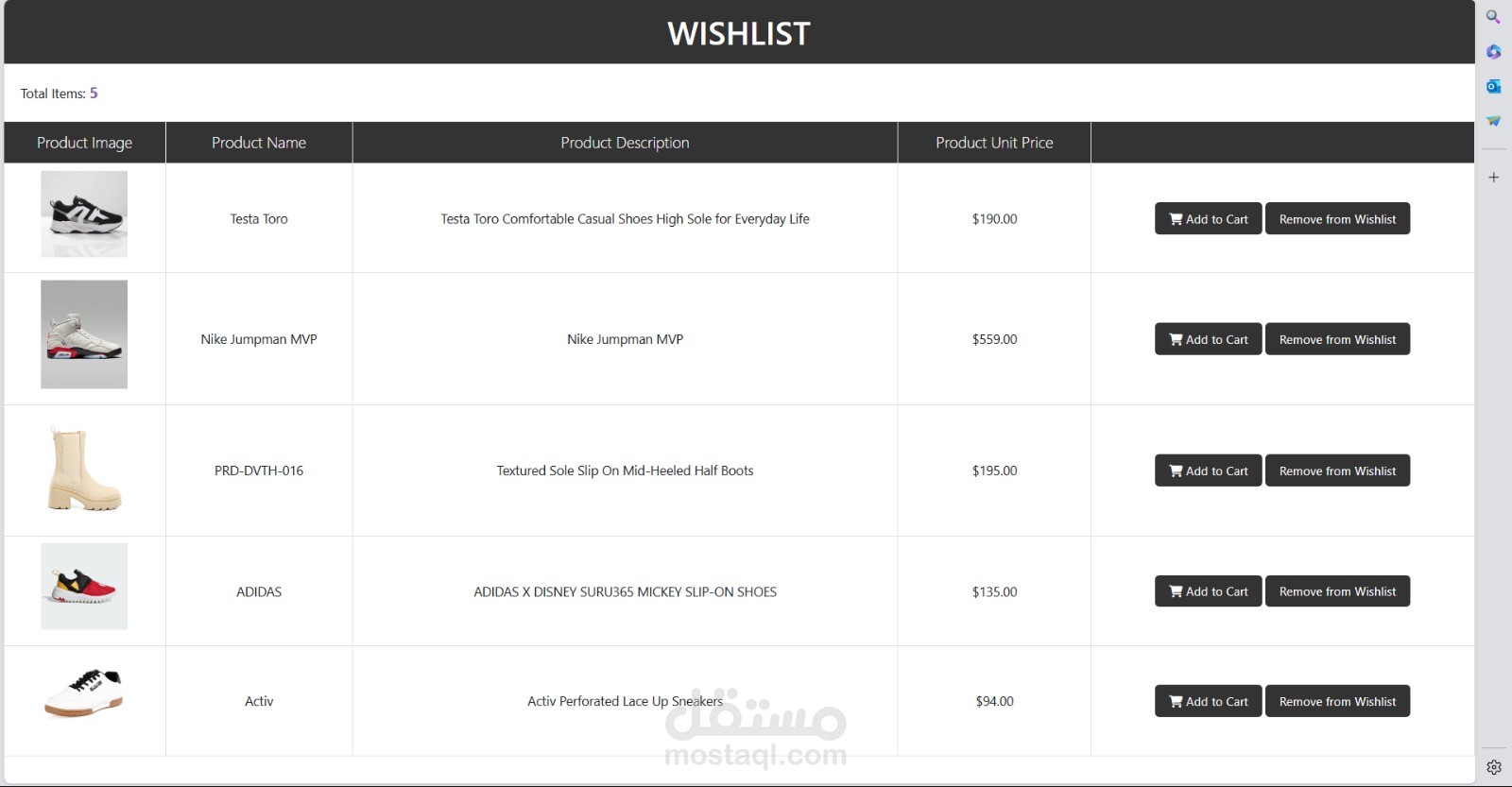 Wishlist items can be easily added to the cart for seamless ordering.