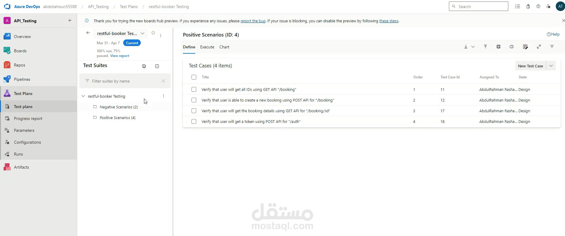Using Azure DevOps for TCs Management, Configure Postman Collection, and finally Using the Postman integration within Newman and Jenkins Pipelines to run and monitor Postman test collections.
