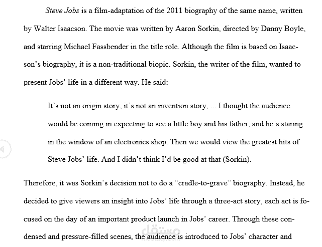 هذه مقالة باللغة الإنجليزية تتحدث عن الفيلم السينمائي "ستيف جوبز" والطريقة التي استخدمها ليحكي قصته..