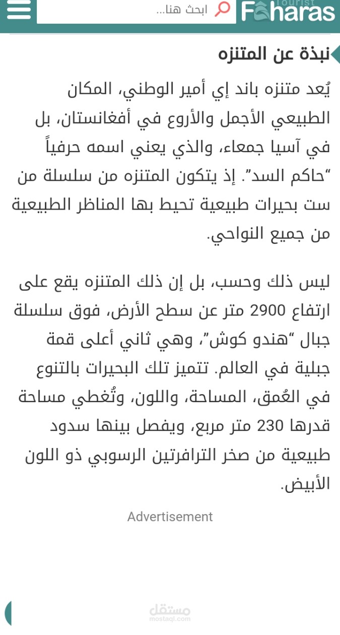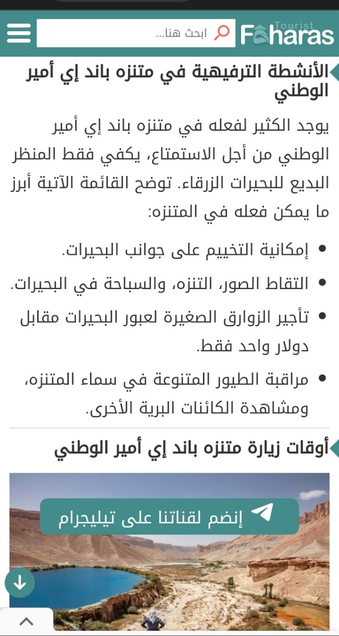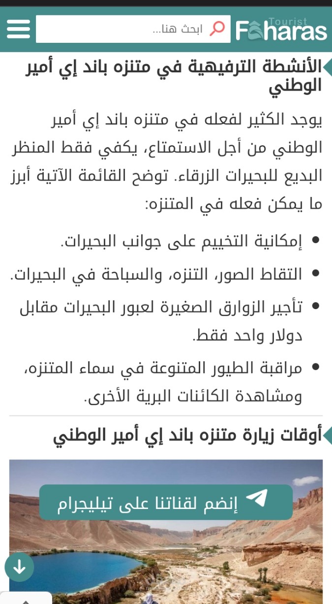 هذا المقال السياحي المفصل يتحدث عن متنزه طبيعي بالكامل من دون تدخل البشر، حيث يقع بوسط الطبيعة في أفغانستان، مع وجود عدد من البحيرات الطبيعية. يصف المقال كل ما يخص ذلك المكان بشكل منظم. كما ويحتوي على معلومات عن الأنشطة الترفيهية في المكان وأفضل الأوقات لزيارته، والكثير من المعلومات الأخرى المعروضة بشكل سلس ومرتب.