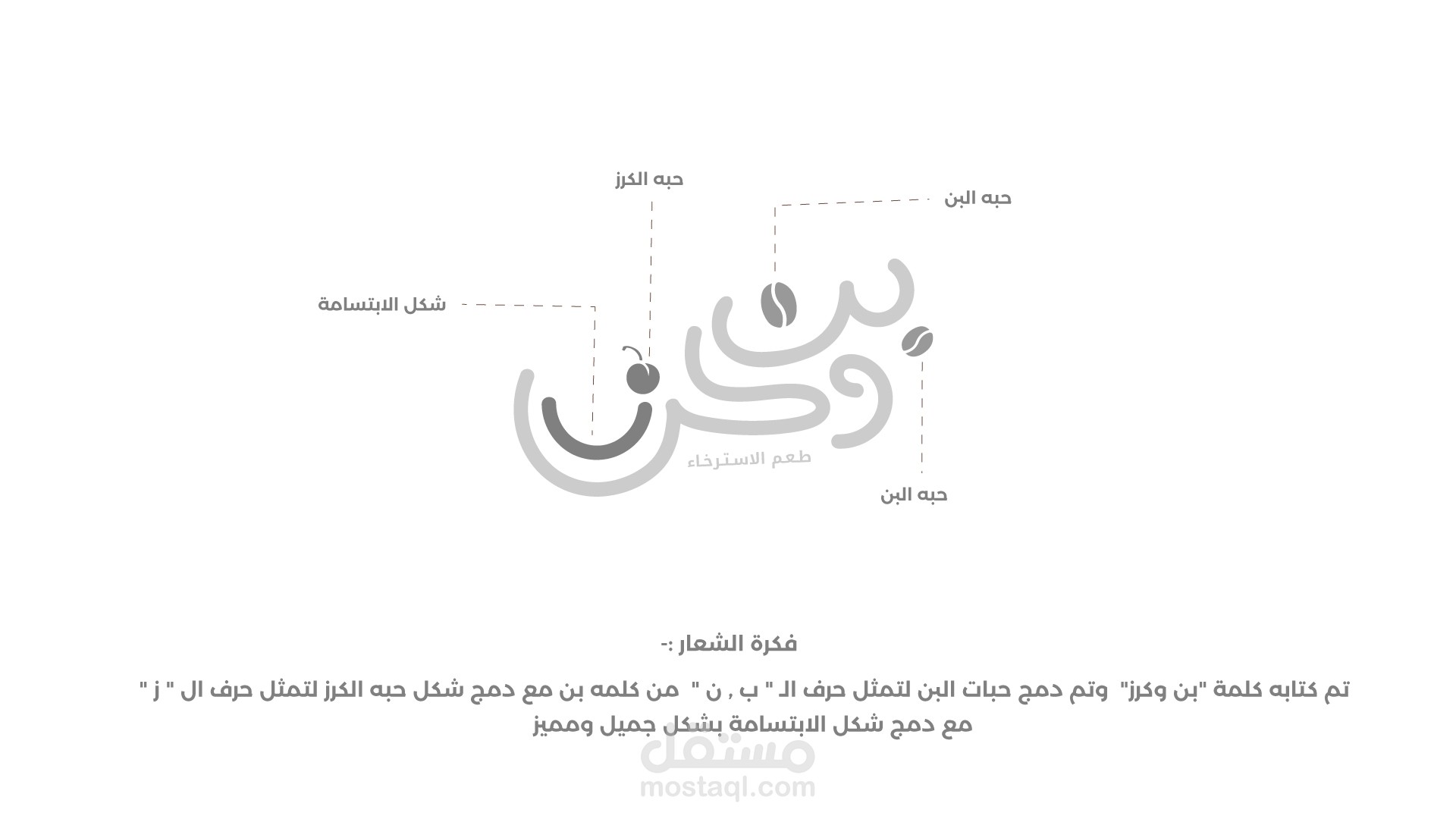 2- تم كتابت كلمه " بن وكرز " بخط اليد وتم دمج حبات البن لتمثل حرف "ب , ن " من كلمه بن مع دمج شكل حبه الكرز لتمثل حرف ال " ز " مع دمج شكل الابتسامه بشكل جميل ومميز