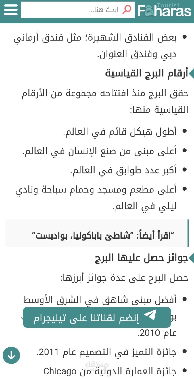 مقال سياحي مفصل يتحدث عن رحلة بناء برج خليفة أطول أبراج العالم وسبب بنائه. كما ويضمن المقال تفاصيل عن مواد البناء المستخدمة في بناء البرج وأيضاً بعض الجوائز والأرقام القياسية الحاصل عليها البرج.
