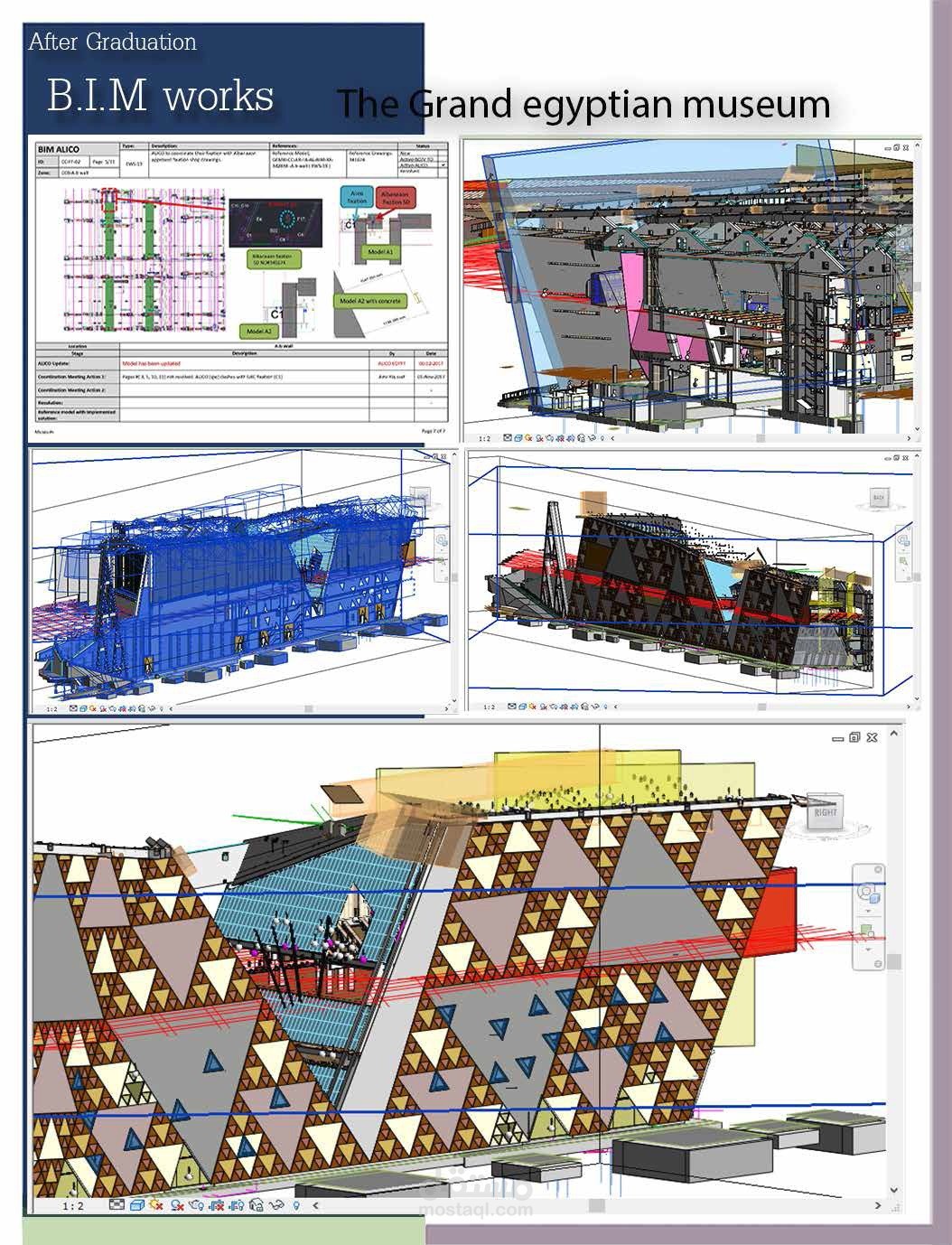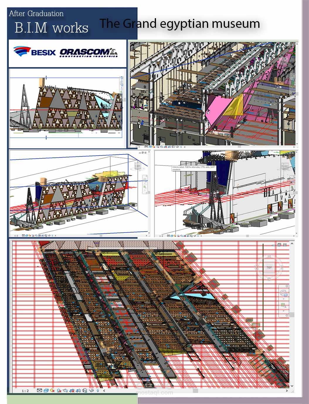 5- مشروع ( المتحف المصري الكبير ) بمساحه حوالي 500 الف متر مربع و يعتبر اكبر متحف في الشرق الاوسط من حيث عدد القطع الاثرية المعروضه و المساحه الكليه بملحقاته و اماكن العرض المختلفه و الحدائق الداخليه و الخارجيه و كنت جزء من فريق اللعمل الذين عملنا علي تصميم الواجات و الفراغات الداخليه للمتحف و تعديلها حسب رؤيه التصميم و لملائمه الفكره الرئيسيه للمشروع و العمل علي الاسقف و كل التفاصيل بواسطه تكنولوجيا ال BIM و البرامج المختلفه المستخدمه فيها Revit و Navisworks و غيرها من البرامج.
