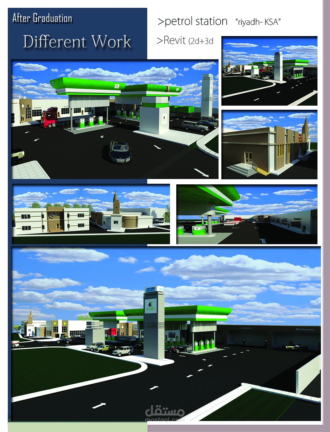 4- مشروع ( محطه وقود ) بمساحه 3000 متر مربع بملحقاتها و المحلات التجاريه و المسجد و مراعاه اماكن التانكات و تخزين الوقود و دراسه كل عمليات الملئ و التفريع و المساحات الكافيه لحركه للشاحنات و وقوفها و توفير كل الخدمات المطلوبه للمشروع.