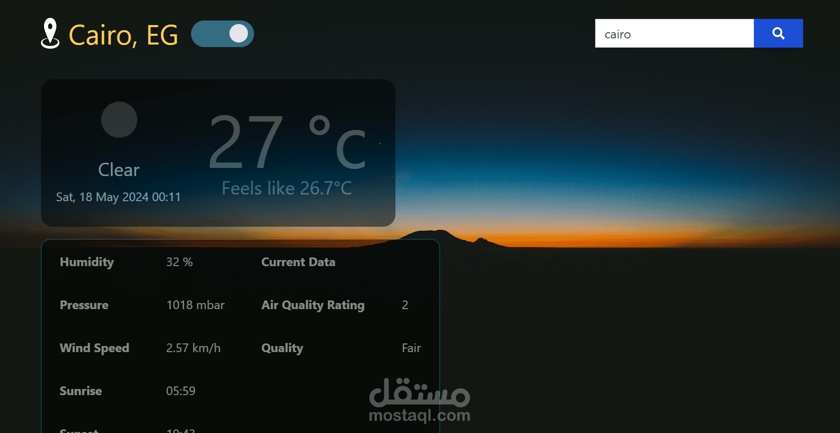 - يمكن للمستخدمين إدخال اسم المدينة أو الرمز البريدي للحصول على حالة الطقس الحالية.