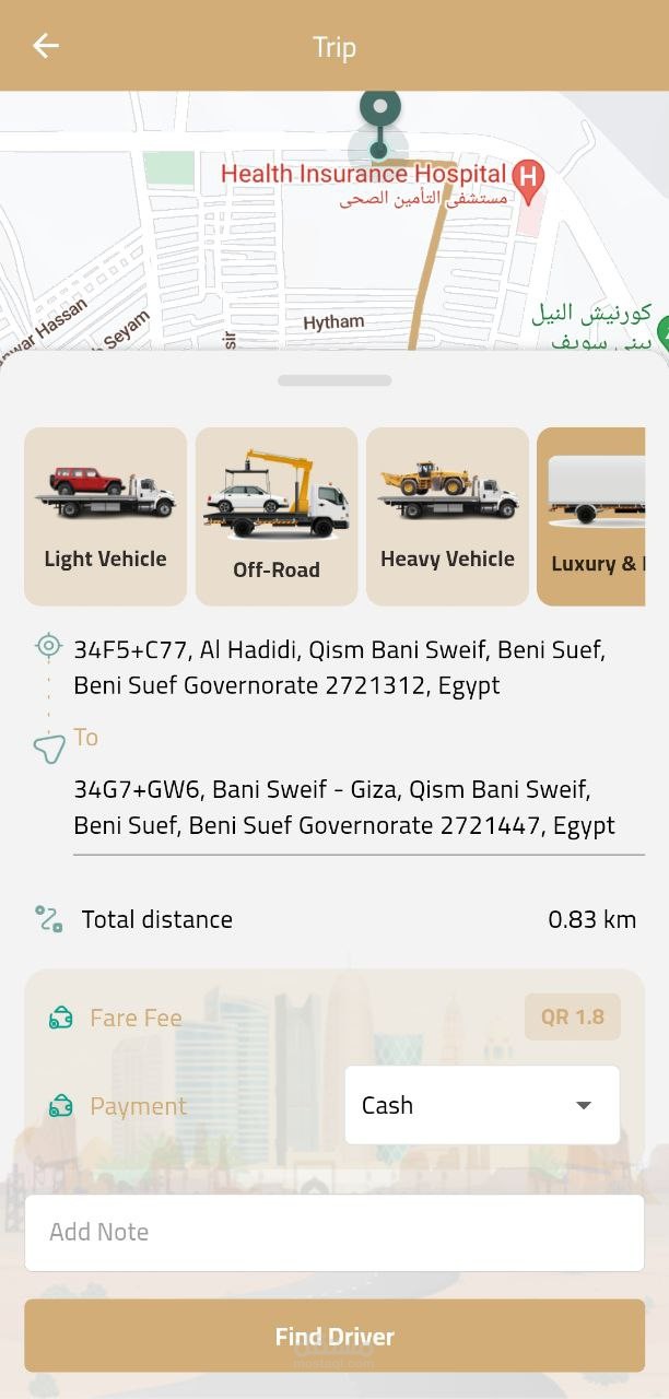 تقوم باختيار الفئه المطلوبه لك ثم يتم التوجيه الي اختبار المكان من علي الخريطه ثم يكوت العميل بارسال طلب بالمكان المراد الذهاب اليه والمكان الحالي ويوجد ايضا سجل الاماكن والمعاملات التي تمت من خلال التطبيق