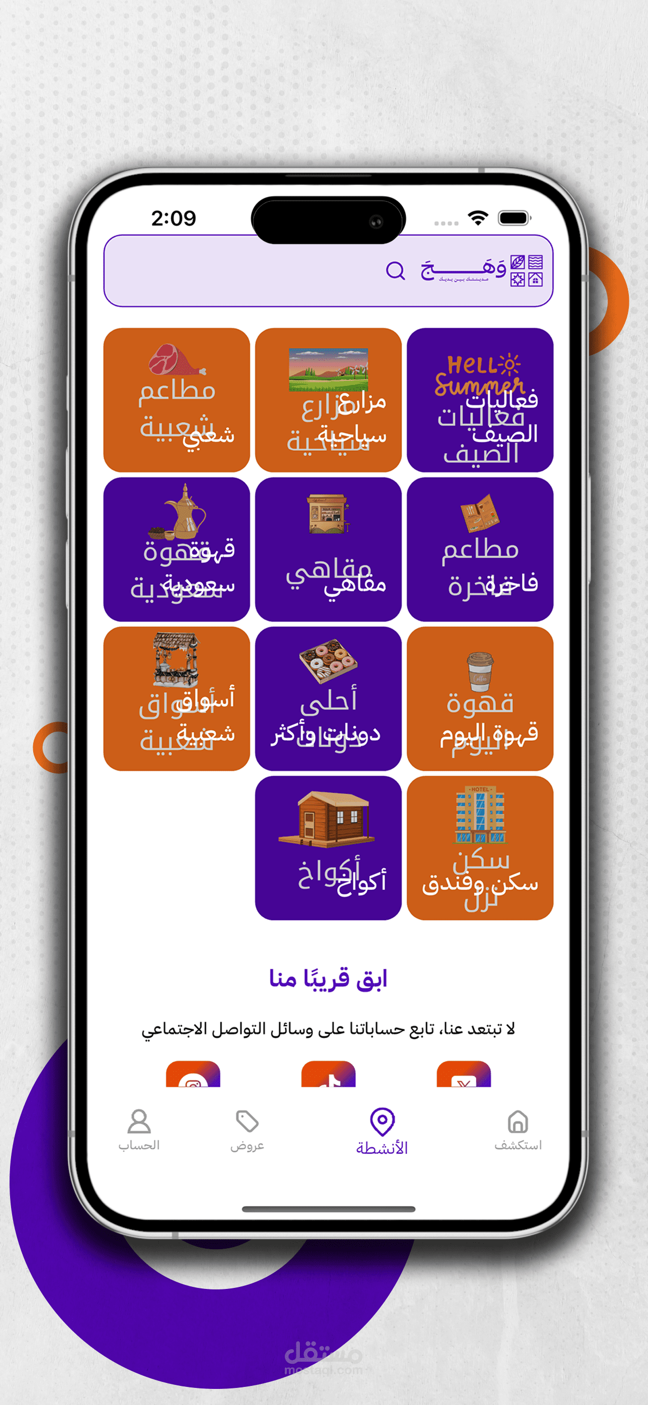 اذا كنت تحب مدينتك ، وتبحث عن أفضل الاماكن والفعاليات ، اذا انت في المكان الصحيح "تطبيق وهــــــج" هو تطبيق شامل لإعلانات الأنشطة والفعاليات والتجارب السياحية و الترفيهية والرياضية والصحية لمدينتك .