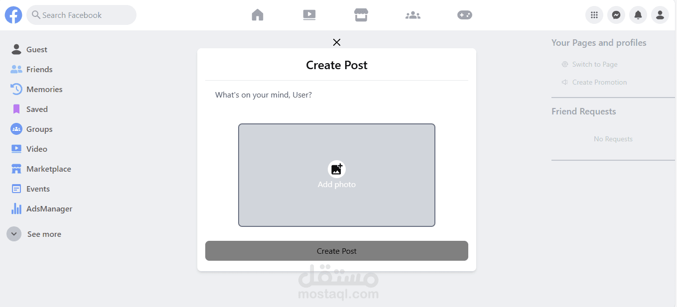 مشروع استنساخ فيسبوك الخاص بي يحاكي تصميم ووظائف منصة فيسبوك، مما يتيح للمستخدمين إضافة القصص والمنشورات تمامًا كما هو الحال على المنصة الأصلية. يكرر التصميم المألوف لفيسبوك، مما يوفر تجربة سلسة ومألوفة للمستخدمين.