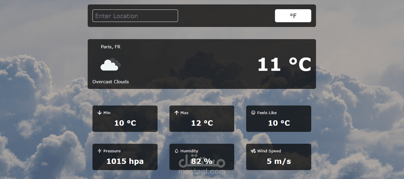 تجربة تحديثات الطقس في الوقت الفعلي مع تطبيق الطقس المبني على React. ببساطة ابحث عن أي دولة، واحصل على معلومات تفصيلية عن الطقس، بما في ذلك درجة الحرارة، الحالة الجوية، والتوقعات. يُعزز التطبيق تجربتك البصرية من خلال تغيير صورة الخلفية بشكل ديناميكي لتعكس حالة الطقس الحالية، مما يوفر رحلة طقس غامرة وغنية بالمعلومات.