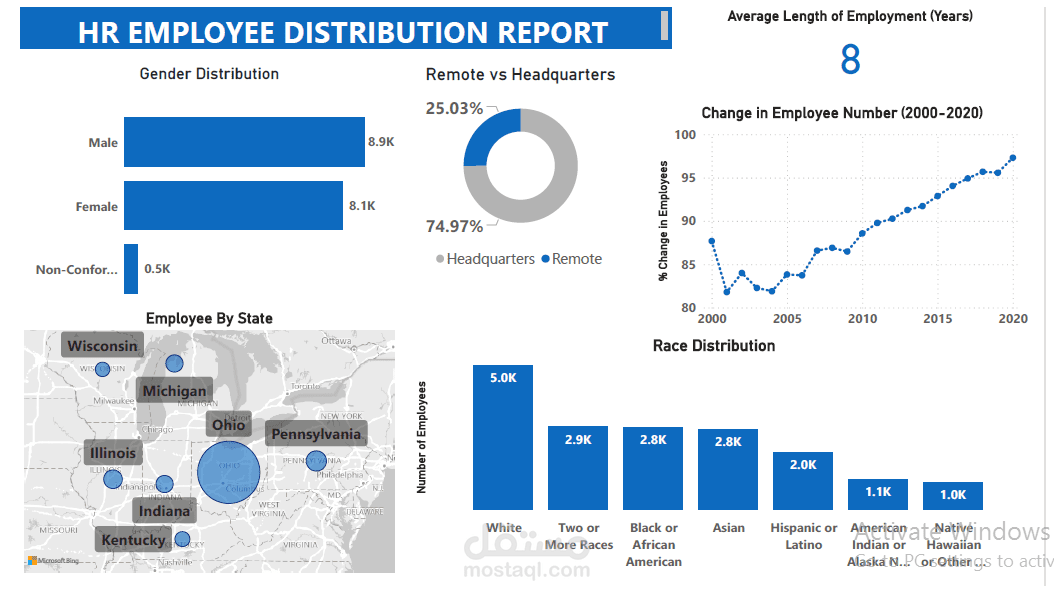 A BI report on HR Data with the aim to find insights on how the employers are distributed