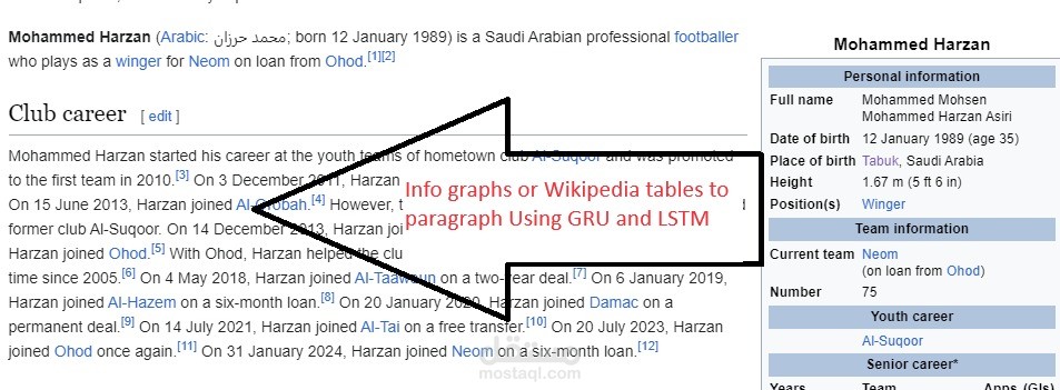 In the project, I utilized TensorFlow and Keras to build a model that converts Wikipedia infobox data into paragraphs. This involved preprocessing the data, designing a model architecture with dual sequential GRU layers, training the model, and using it for inference to generate paragraphs