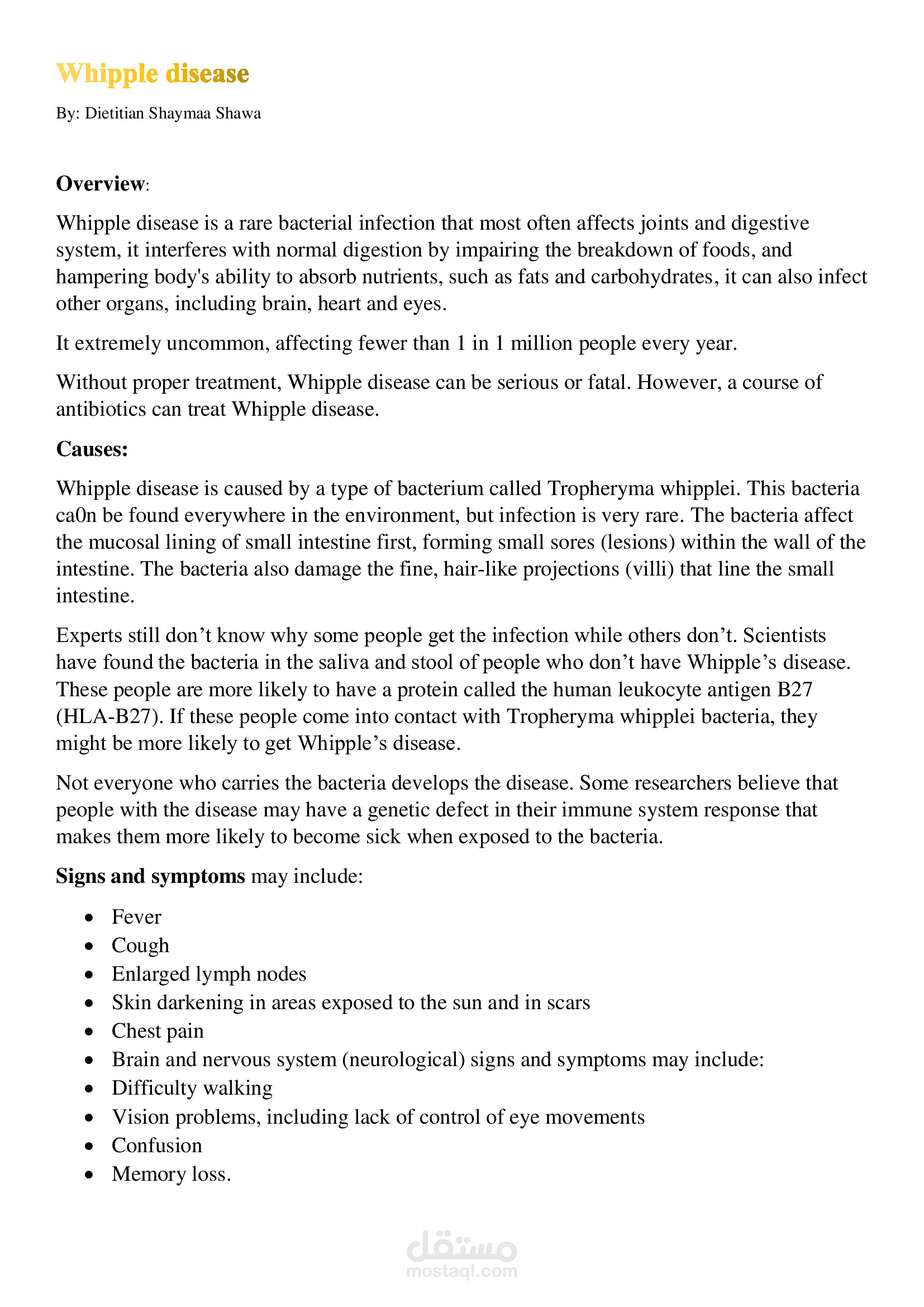 قمت بكتابة العديد من الأبحاث العلمية والمقالات الطبية ، أولاً قمت بالتواصل مع العميل وفهم الغاية من البحث واخذ التفاصيل اللازمة وملاحظات العميل، ومن ثم قمت بجمع المعلومات من مصادر موثوقة و تحديدًا من قواعد البيانات الطبية ك PubMedمع التأكد من صحتها ، مع الحرص على شمل الموضوع بشكل كامل وواضح (حسب طلب العميل)، وبعد الانتهاء من مرحلة جمع المعلومات واكتمال أقسام البحث قمت بإعادة صياغة المعلومات بطريقة احترافية، أما الشكل النهائي وتنسيق البحث تم بعد النقاش مع العميل لاخراجه بأفضل صورة حسب الهدف منه.