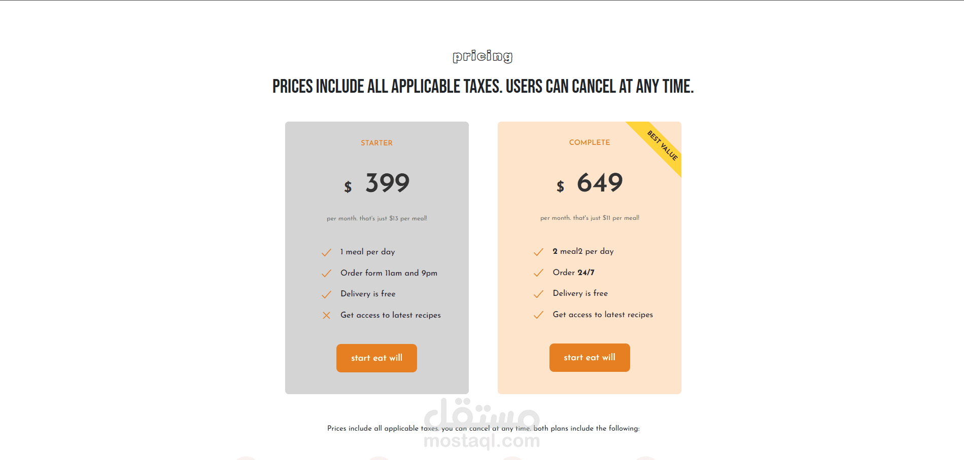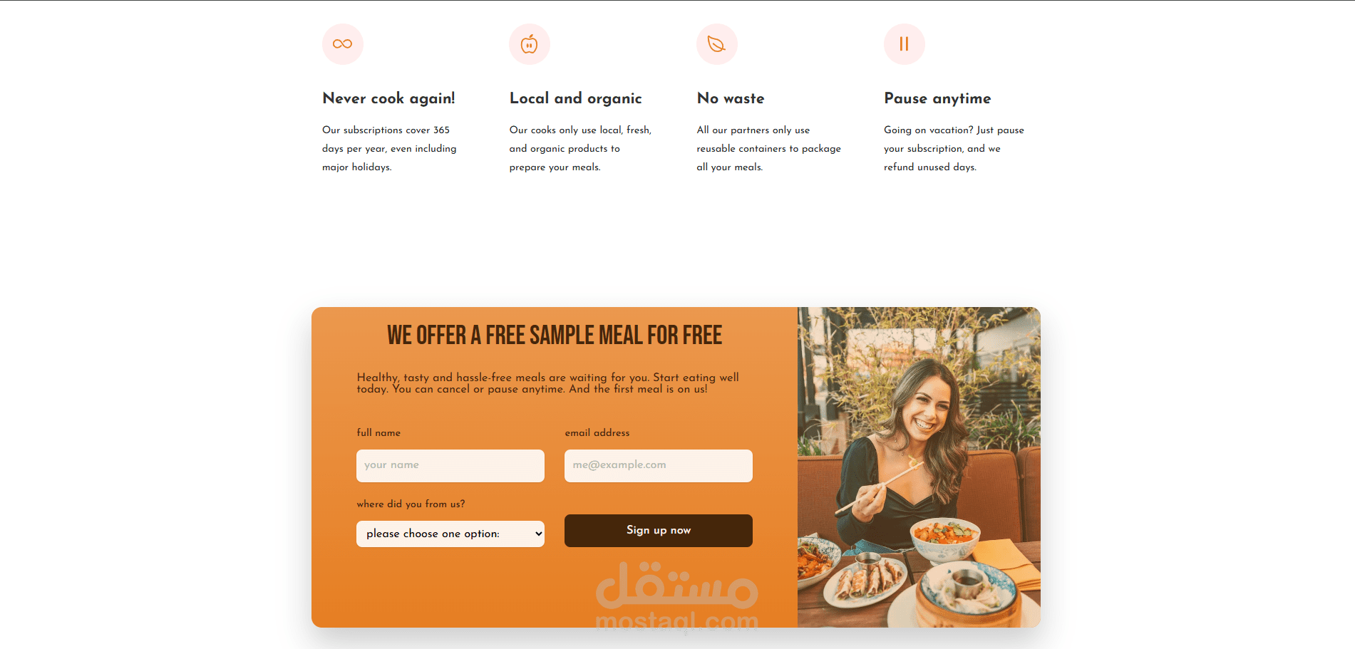 صفحة هبوط مصمّمة لخدمة توصيل وجبات غذائية صحية، مستوحاة من مشاريع ستارت آب حديثة. تحتوي على أقسام واضحة مثل: كيف تعمل الخدمة، الوجبات، آراء العملاء، خطط الأسعار، ونموذج الاشتراك.