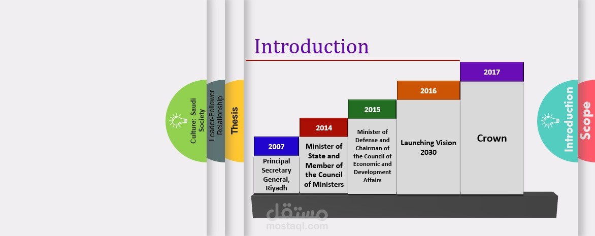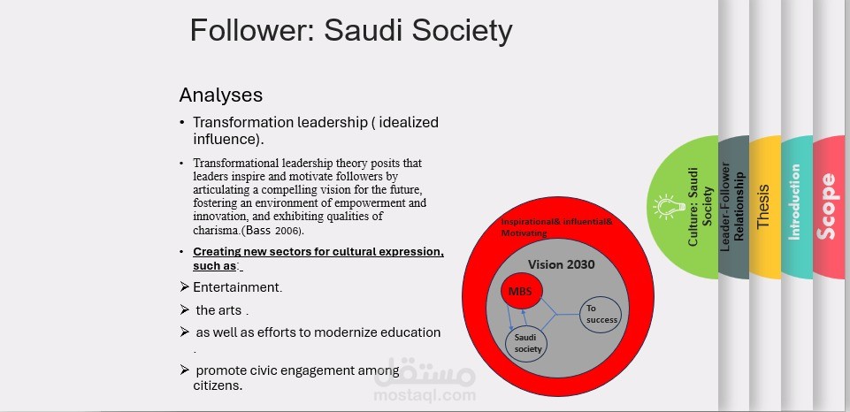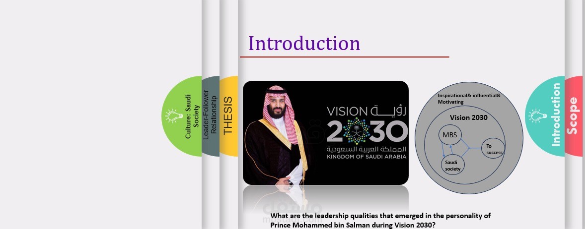 This presentation delves into the ambitious and forward-thinking Vision 2030 plan spearheaded by Crown Prince Mohammed bin Salman. It explores the strategic initiatives aimed at diversifying Saudi Arabia's economy, reducing its dependency on oil, and transforming the Kingdom into a global hub for innovation and investment. Through detailed analysis, we will examine the key pillars of Vision 2030, the progress made thus far, and the transformative impact on Saudi society and its future. Join us as we uncover the visionary leadership driving one of the most significant socio-economic reforms in the modern era.
