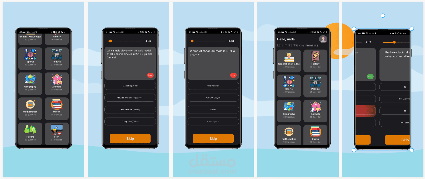 The Quizzey application is an online application that has many sections. Each section contains a specific number of questions that change constantly.