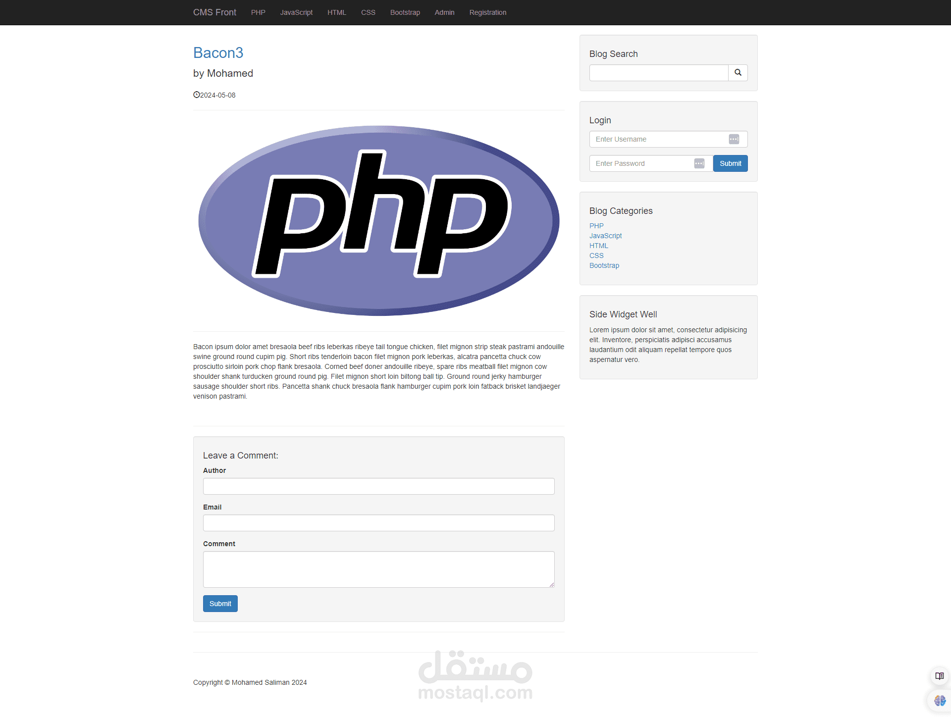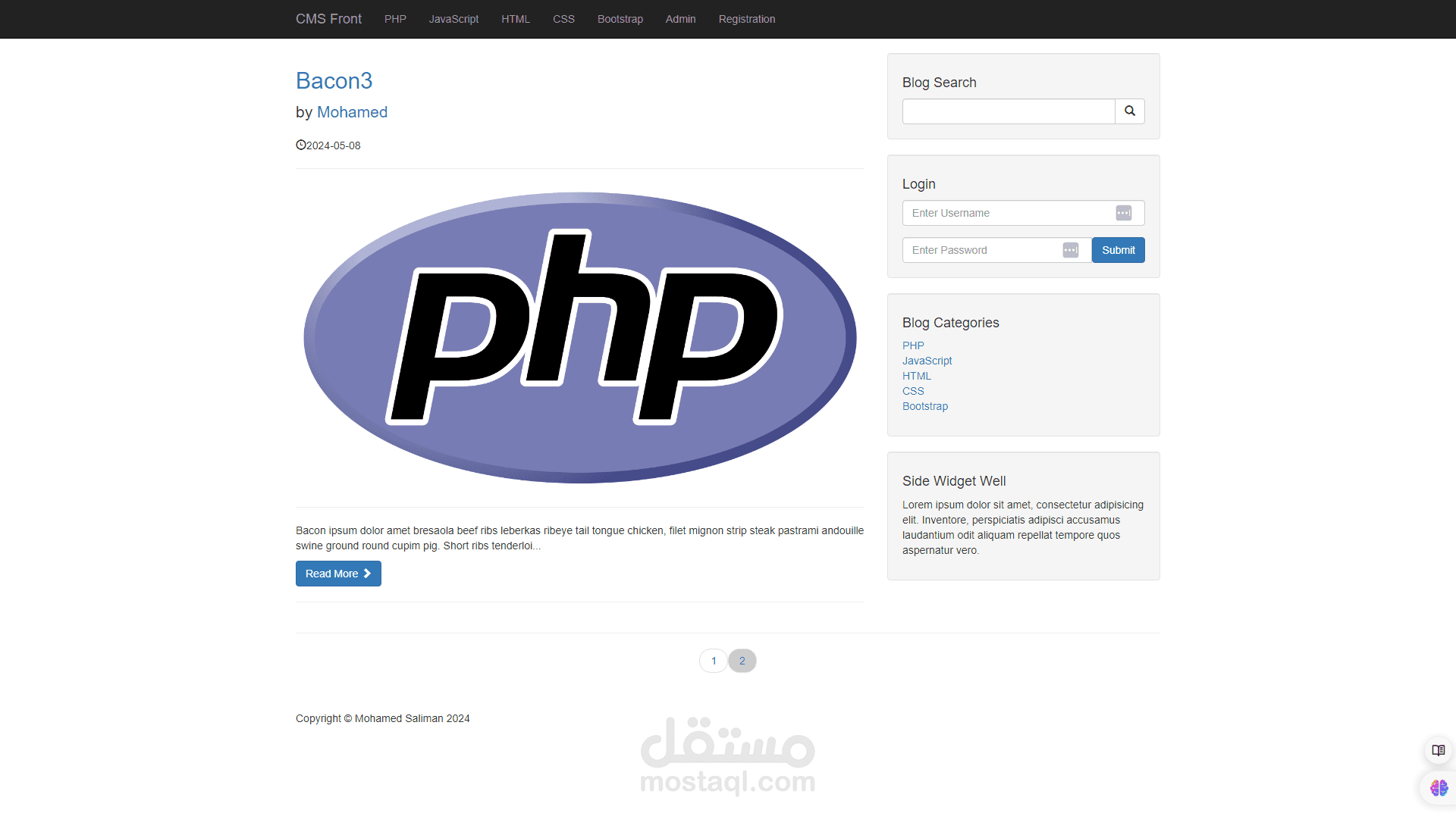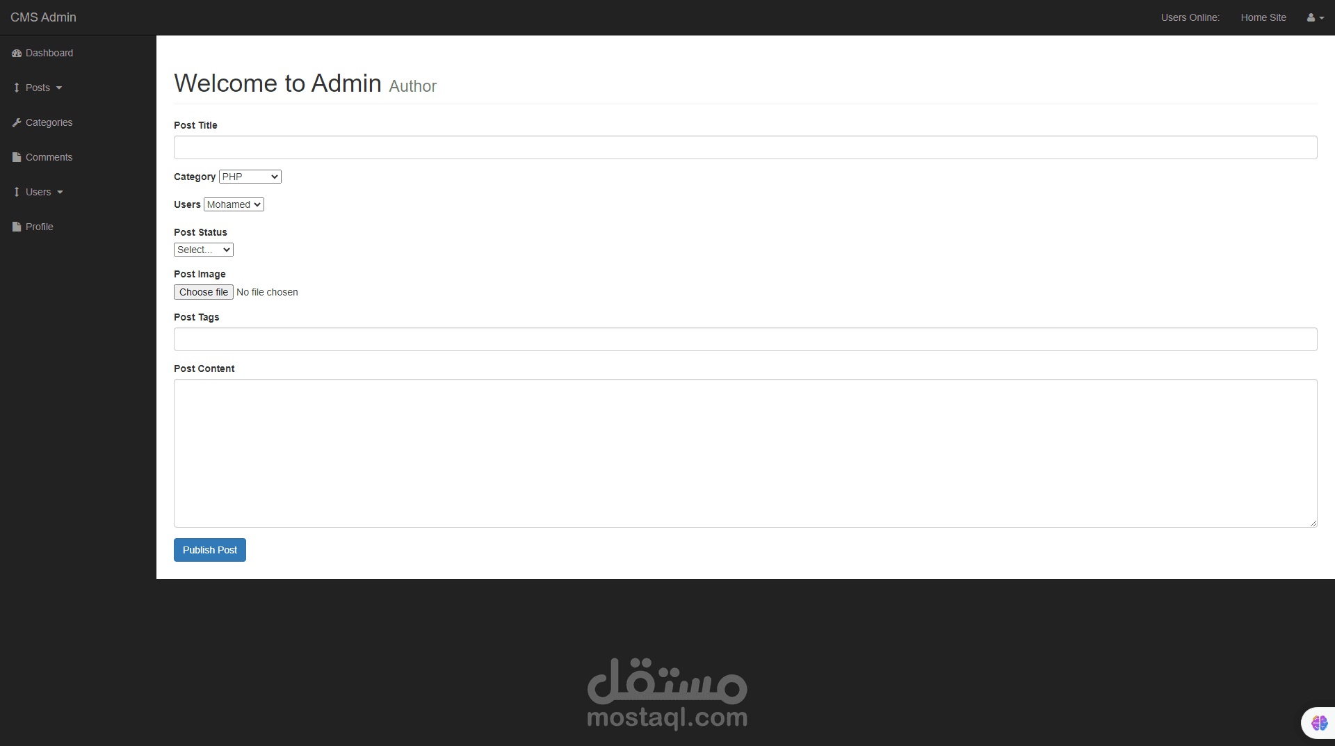 هذا العمل هو عمل يقوم بانشاء عدد من المنشورات عن طريق لوحة تحكم متكاملة تقوم علي انشاء مجموعة من المنشورات في البداية يقوم الادمن او المسئول عن لوحة التحكم القيام باضافة منشورات وتصنيفات هذه المنشورات كما يقوم ايضا باضافة مستخدمين جدد الي لوحة التحكم كما يمكن للادمن ايضا التحكم في نظام التعليقات في المدونة بالاضافة الي تعديل التصنيفات وحذفها ويمكن لهذه المدونة ايضا ان يقوم المستخدم في جزء frontendالقيام بتسجيل الدخول وايضا يمكنه الدخول الي كل منشور والتعليق عليه هذه المدونة تم عملها ب الكامل بلغة php