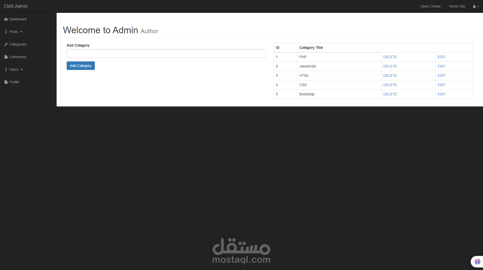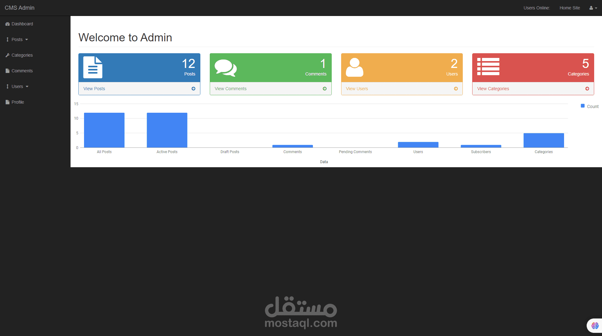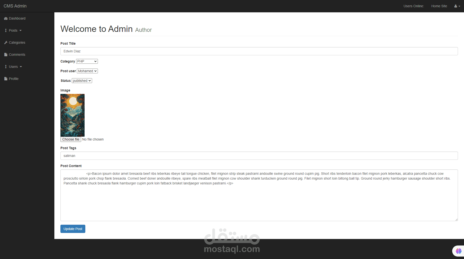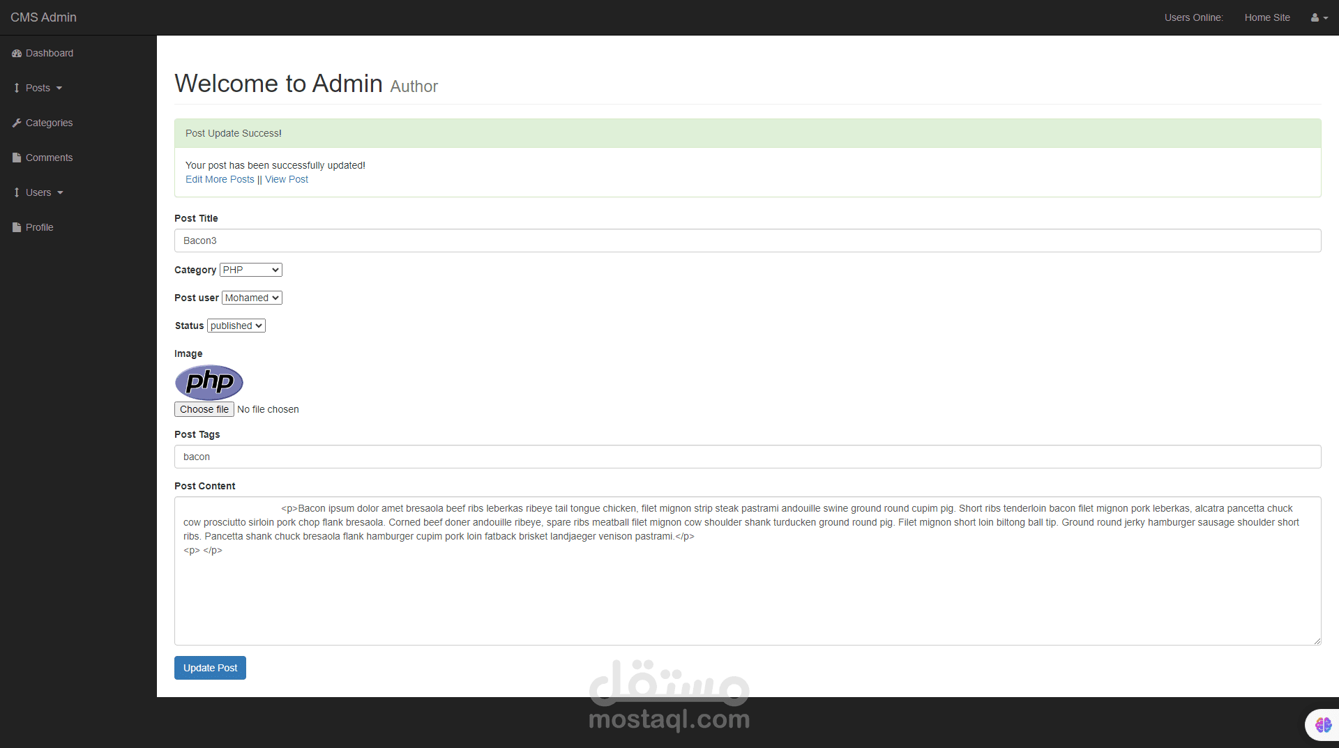 هذا العمل هو عمل يقوم بانشاء عدد من المنشورات عن طريق لوحة تحكم متكاملة تقوم علي انشاء مجموعة من المنشورات في البداية يقوم الادمن او المسئول عن لوحة التحكم القيام باضافة منشورات وتصنيفات هذه المنشورات كما يقوم ايضا باضافة مستخدمين جدد الي لوحة التحكم كما يمكن للادمن ايضا التحكم في نظام التعليقات في المدونة بالاضافة الي تعديل التصنيفات وحذفها ويمكن لهذه المدونة ايضا ان يقوم المستخدم في جزء frontendالقيام بتسجيل الدخول وايضا يمكنه الدخول الي كل منشور والتعليق عليه هذه المدونة تم عملها ب الكامل بلغة php