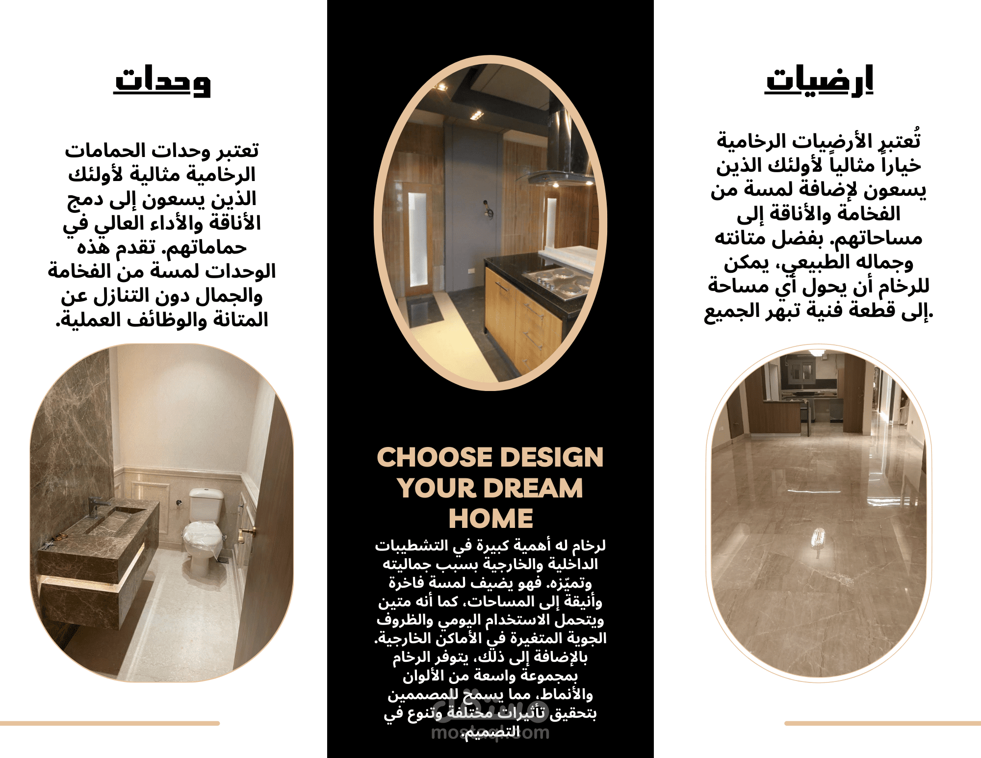 بروشور يحتوي على بعض اعمال شركة البتول اونكس المتخصصه في اعمال الرخام والجرانيت يعكس الطابع الخاص بالشركه ويميزها عن غيرها من المنافسين في نفس المجال