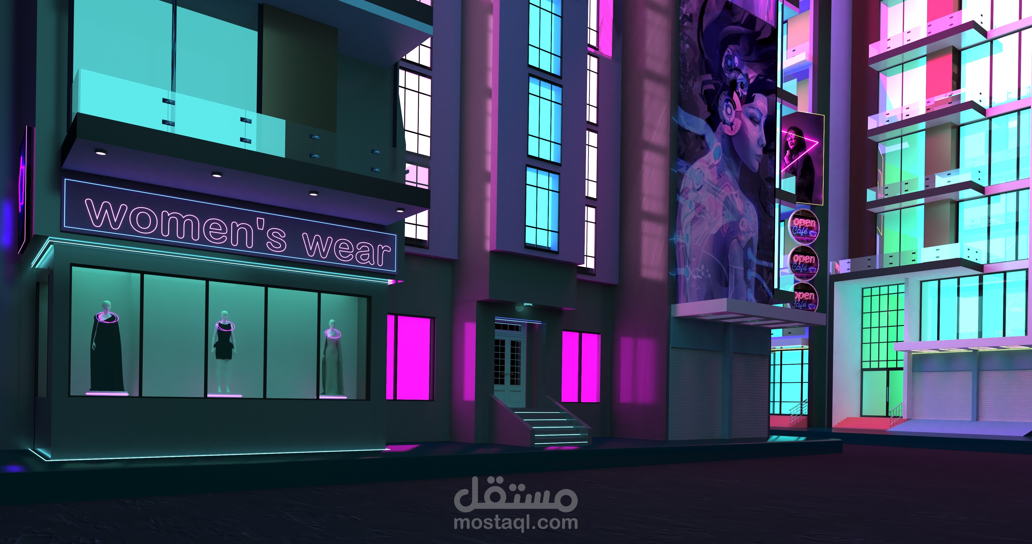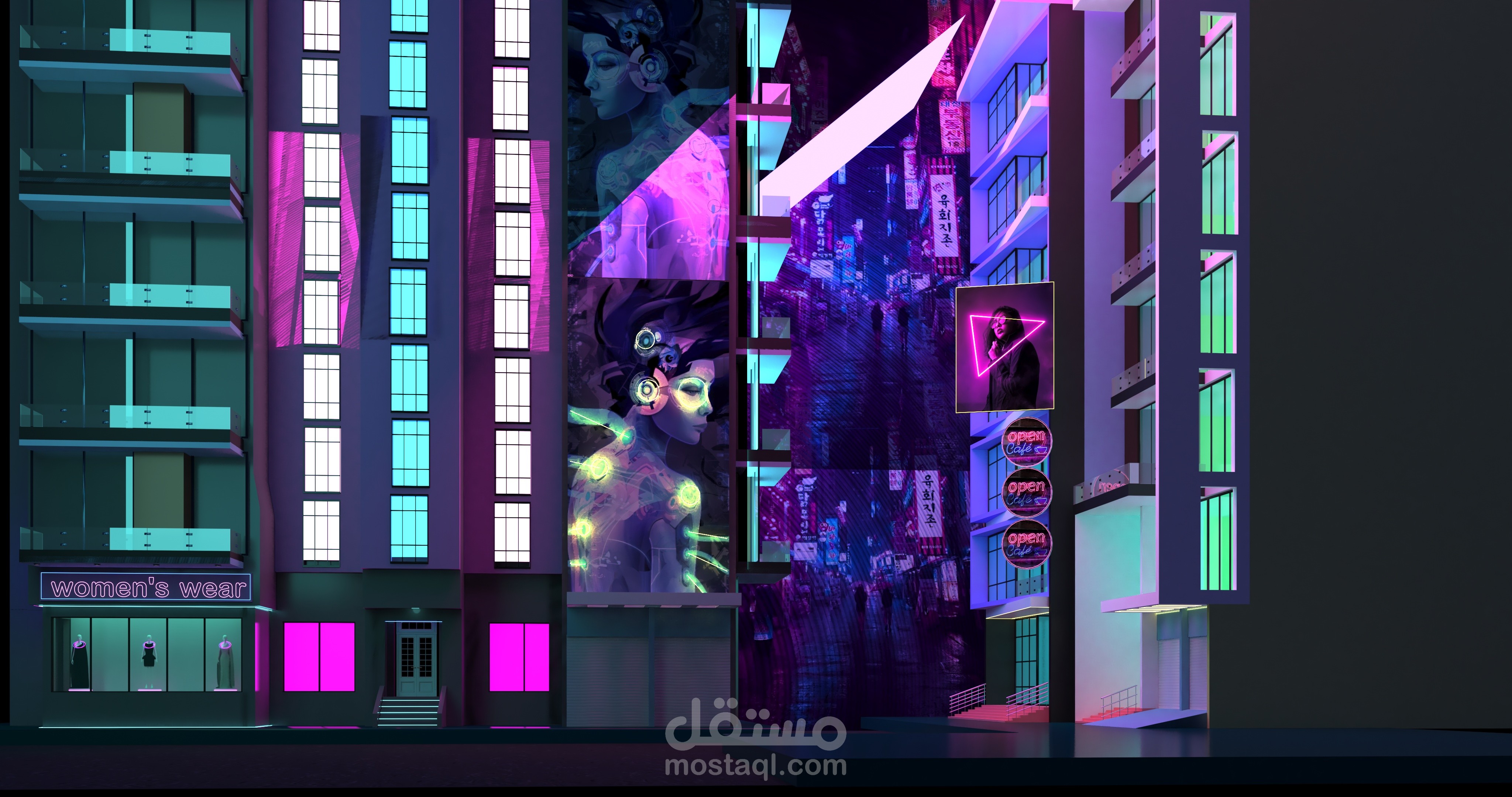 and exterior design for the streets of El Ma3ady for the novel “ The Blue Elephant” in Cyberpunk style (3ds Max & Vray ).