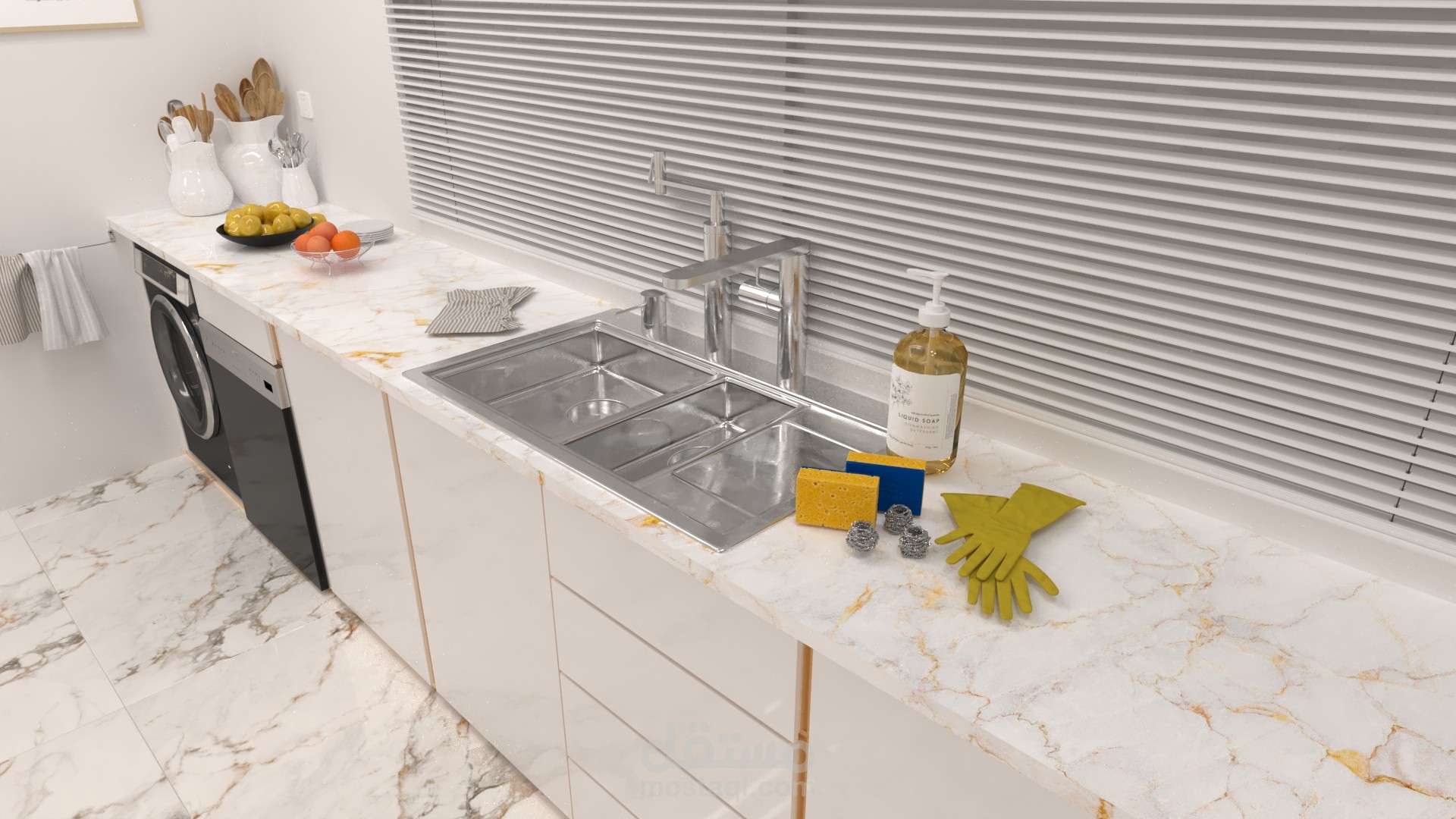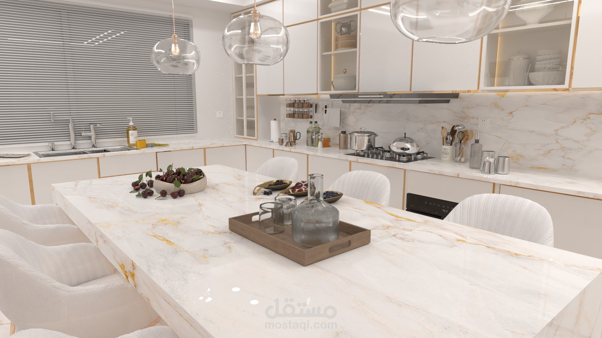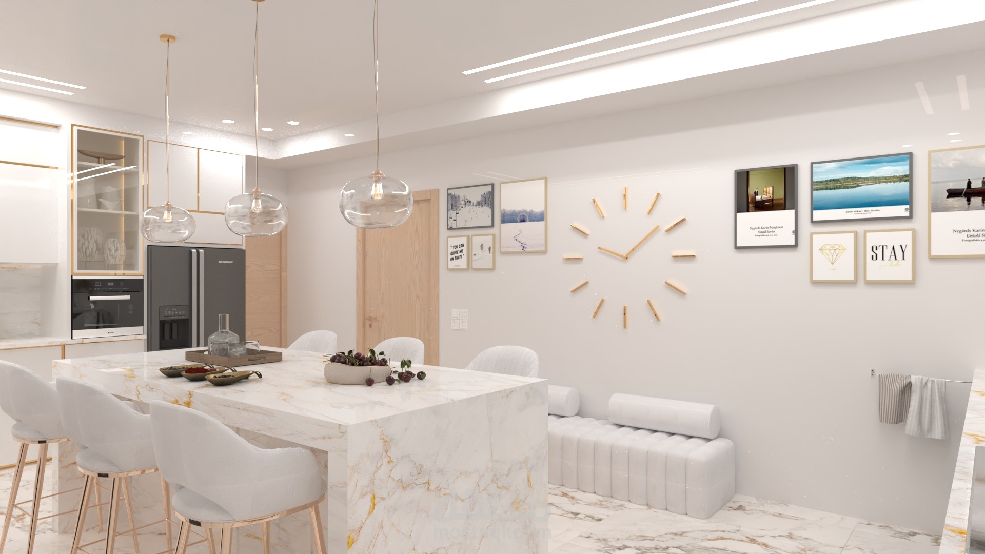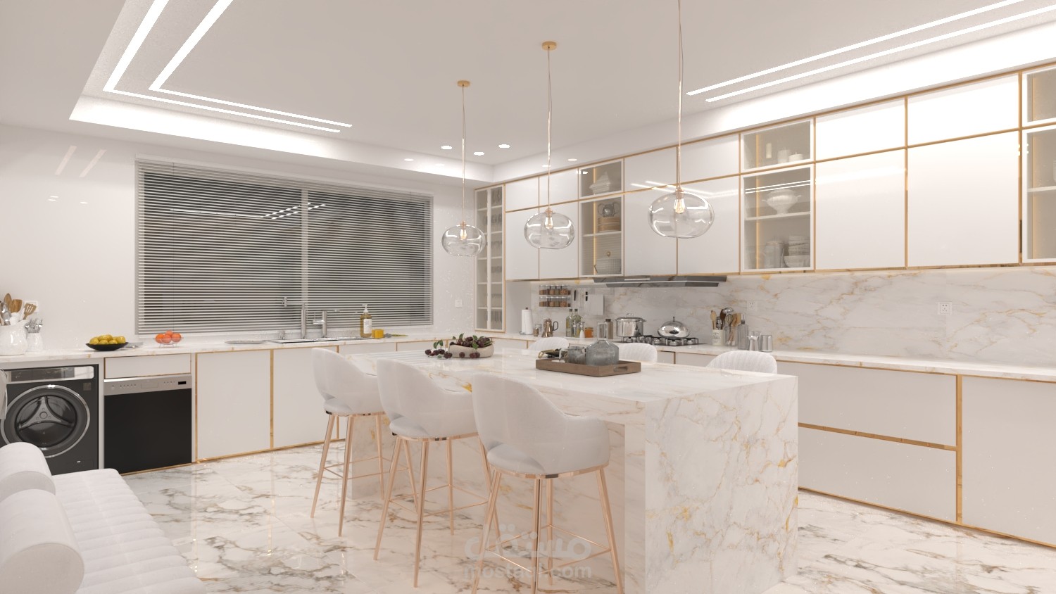 النقطة البؤرية في التصميم هي جزيرة المطبخ (Kitchen Island) الضخمة المُغطاة بالكامل بالرخام الفاخر ذي العروق الذهبية، والتي تخدم كمنطقة إعداد وعمل رئيسية، مع دمج مقاعد بار لاستغلالها كمنطقة تناول طعام يومية.