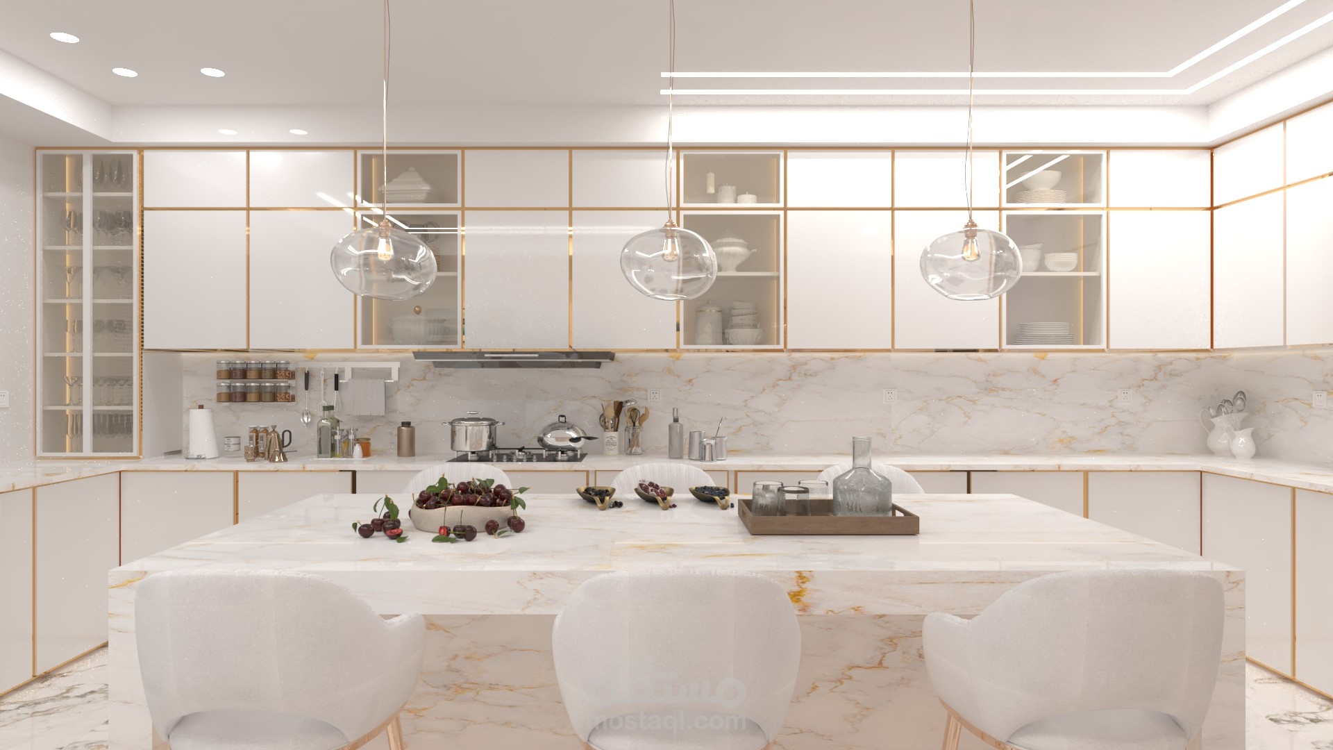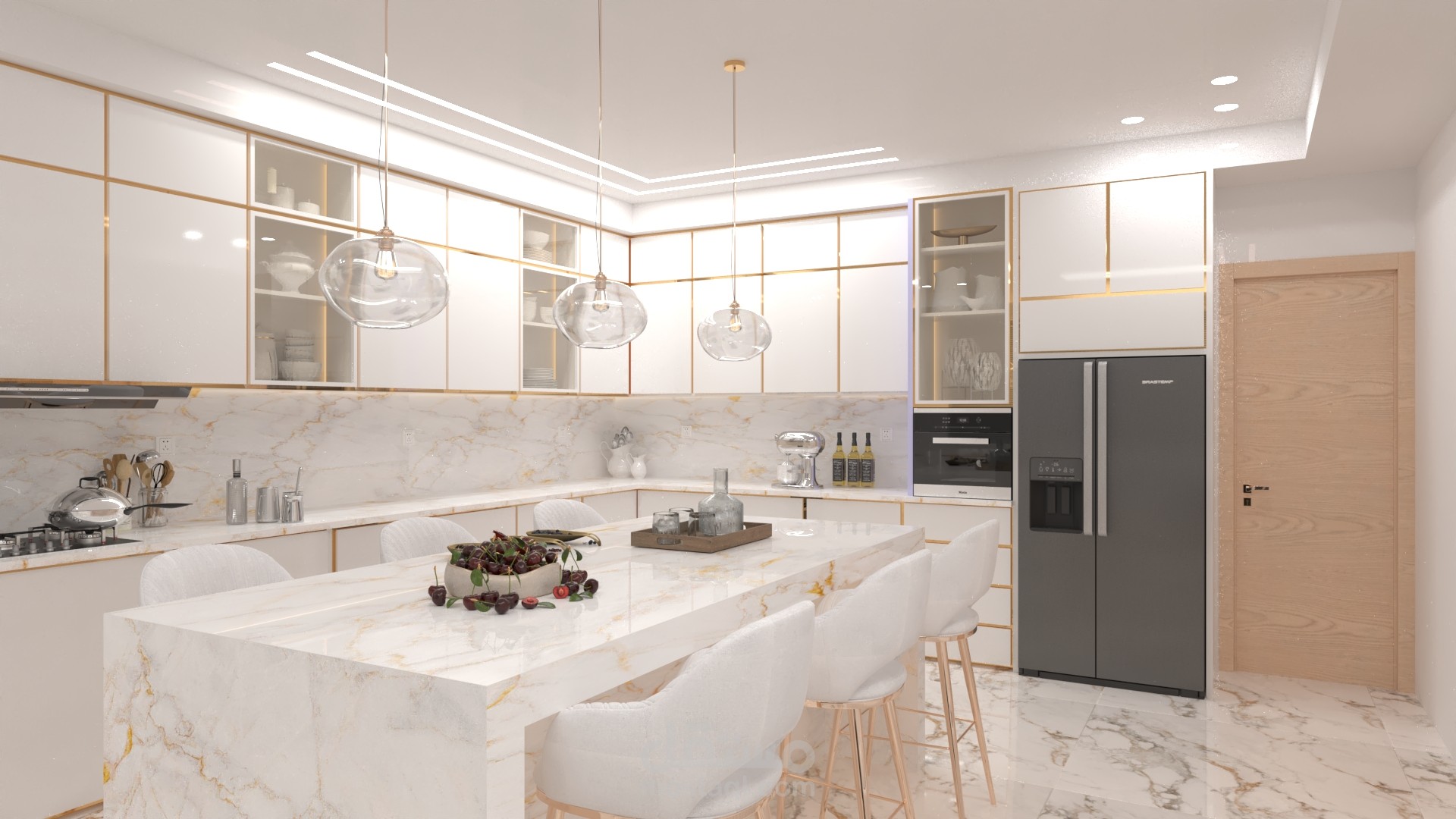 يُمثّل التصميم مطبخاً مغلقاً يجمع بين الكفاءة الوظيفية العالية و الفخامة المعاصرة. تم اختيار لوحة ألوان مُنيرة تعتمد على الأبيض اللامع كقاعدة، مُدعّمة بتفاصيل معدنية ذهبية لتحديد الخزائن وإضافة لمسة من البريق الراقي.