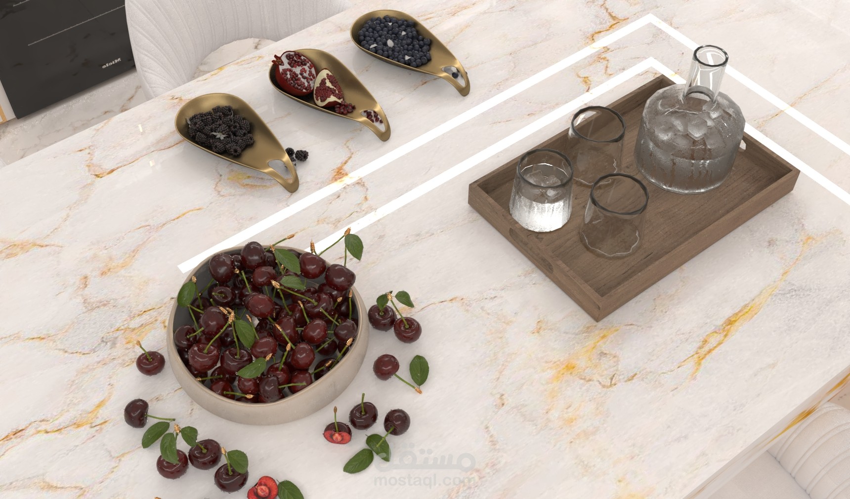 هذا العمل هو تصميم داخلي رقمي ثلاثي الأبعاد (3D Interior Design)، تم إنجازه بواقعية عالية باستخدام برنامج Autodesk 3ds Max ومحرك الإظهار V-Ray.