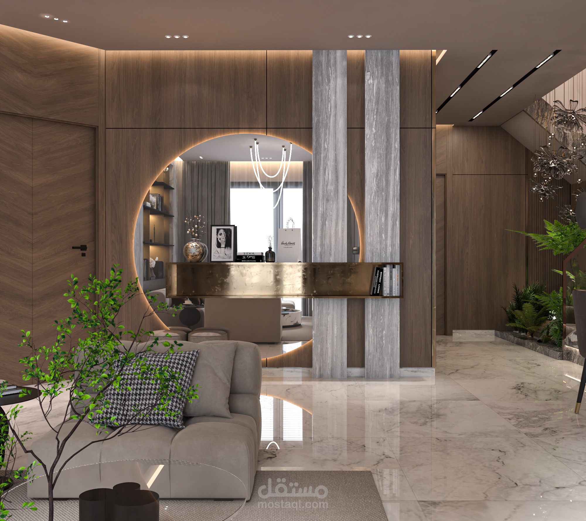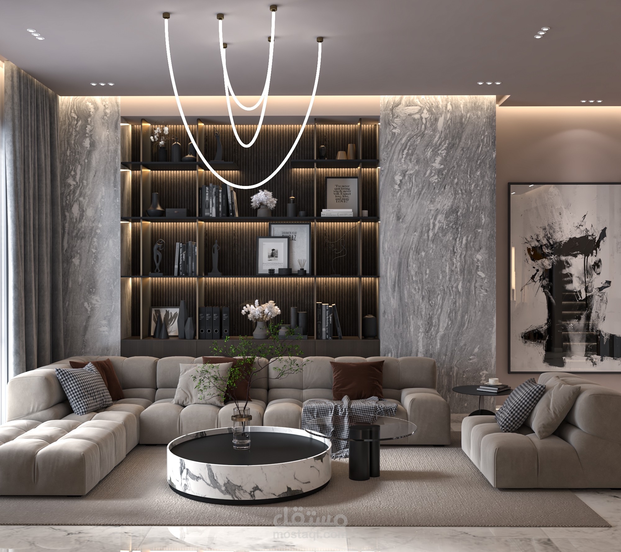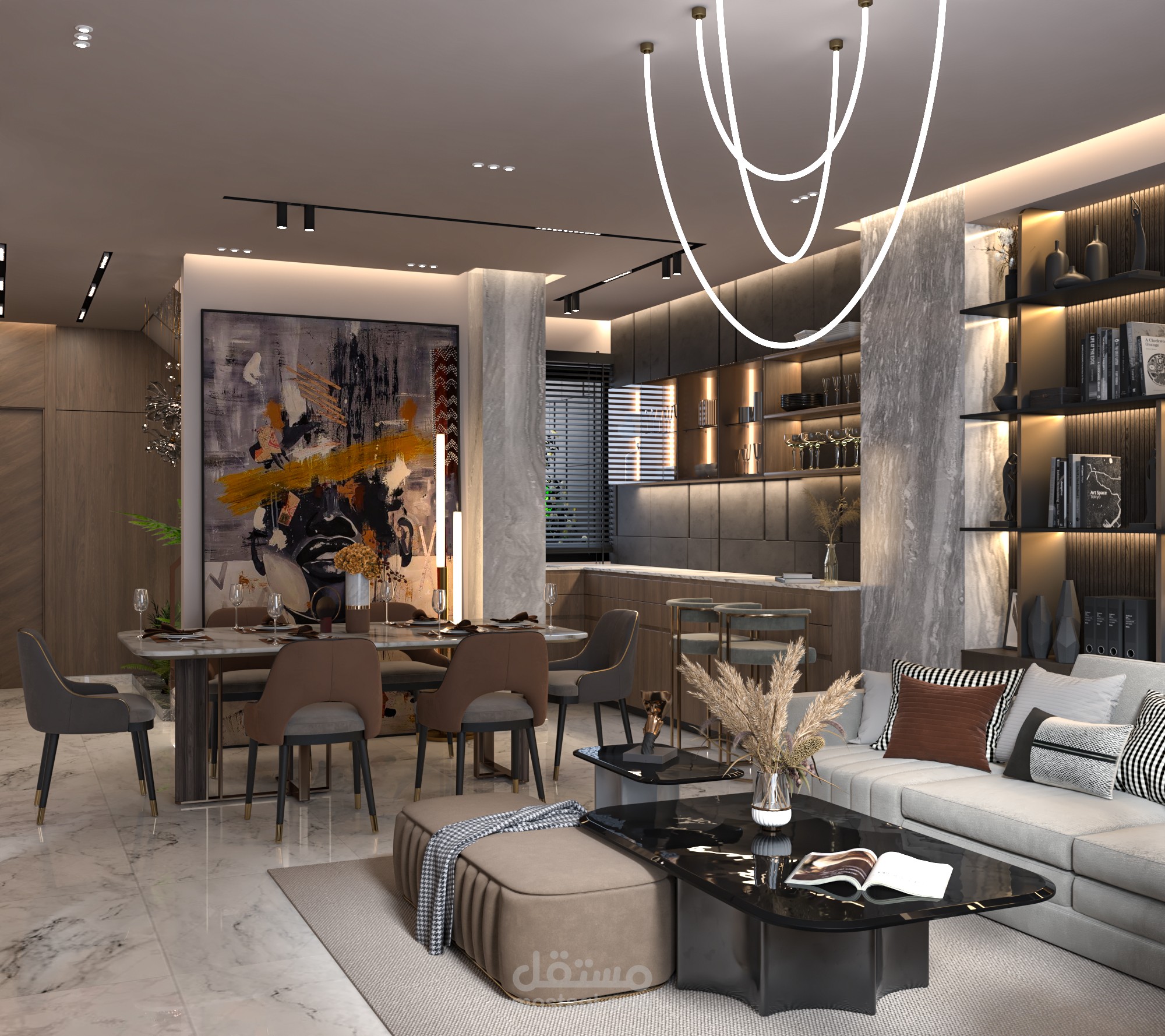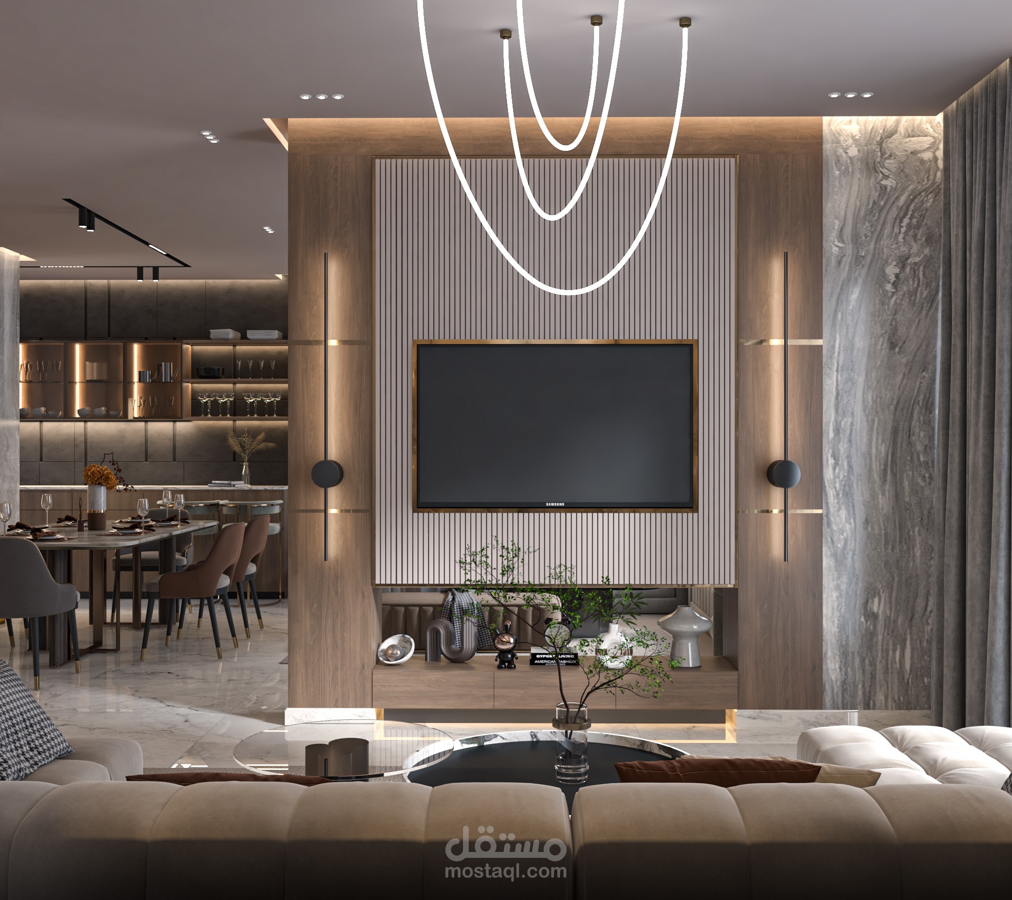 تصميم مودرن دور أرضى لفيلا بالكويت تحتوى على غرفة معيشه و منطقة استقبال و غرفة طعام و مطبخ صغير تم وضع التلفزيون فى المنتصف بآلية دواره ليخدم على منطقة الاستقبال و غرفة المعيشه بناءا على طلب العميل من اختيار الالوان و الستايل.