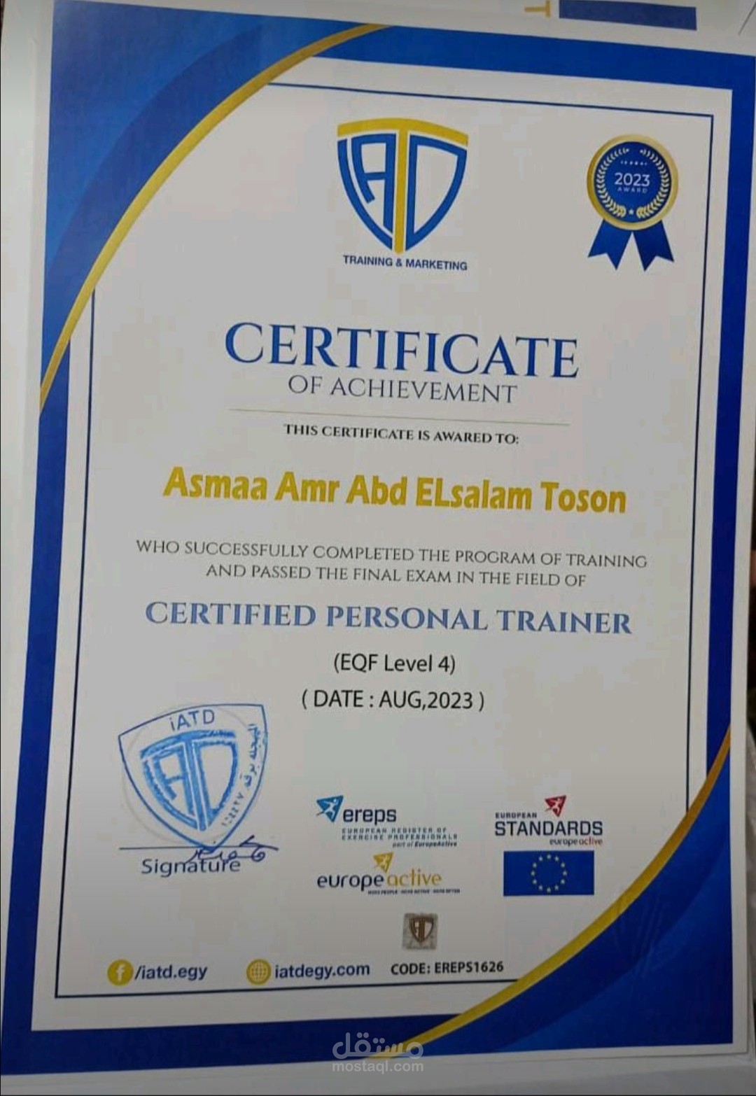 شهادة اجتياز كورس المدرب الشخصي في IATD Academy