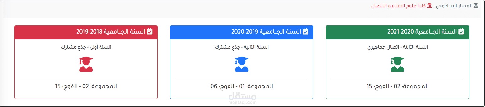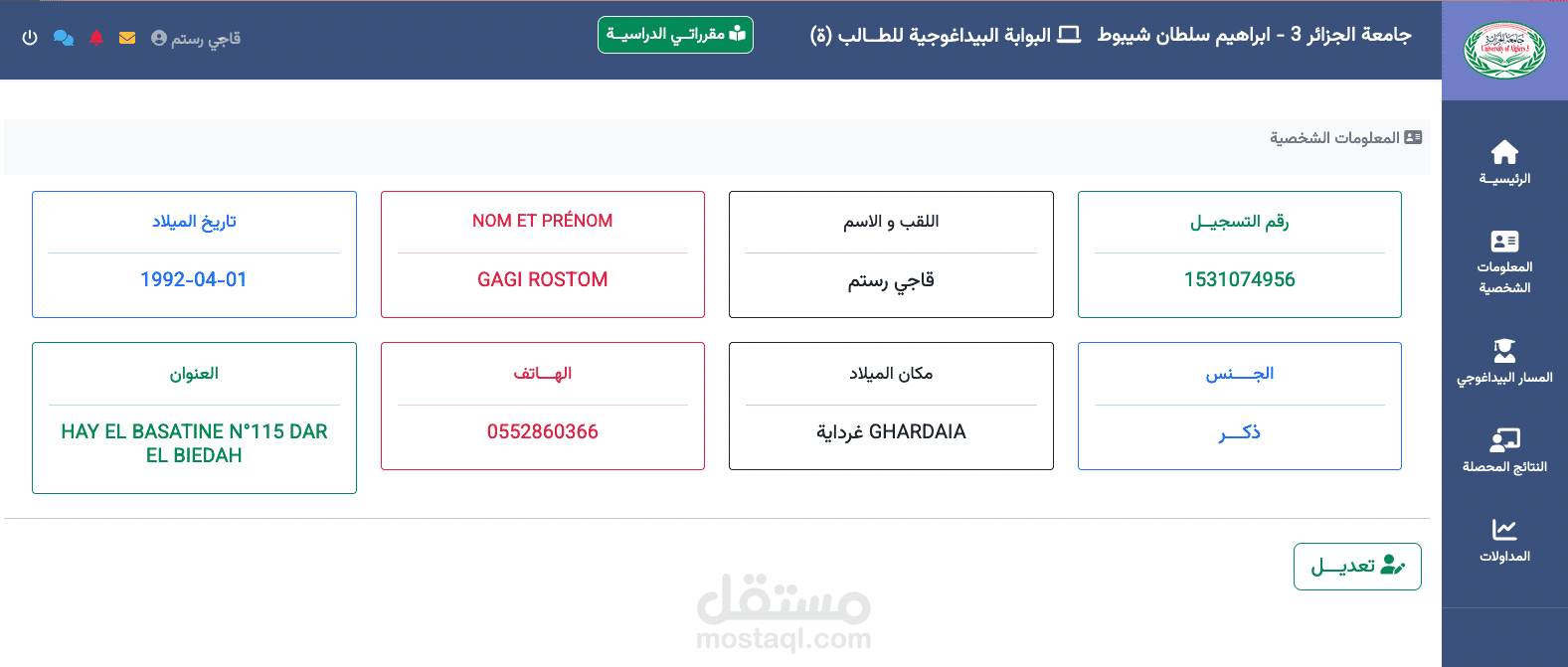- الدخول الى الملف الشخصي و معاينة المعلومات البيداغوجية(التخصص، الأفواج، معلومات الولوج لمنصات التعليم عن بعد)