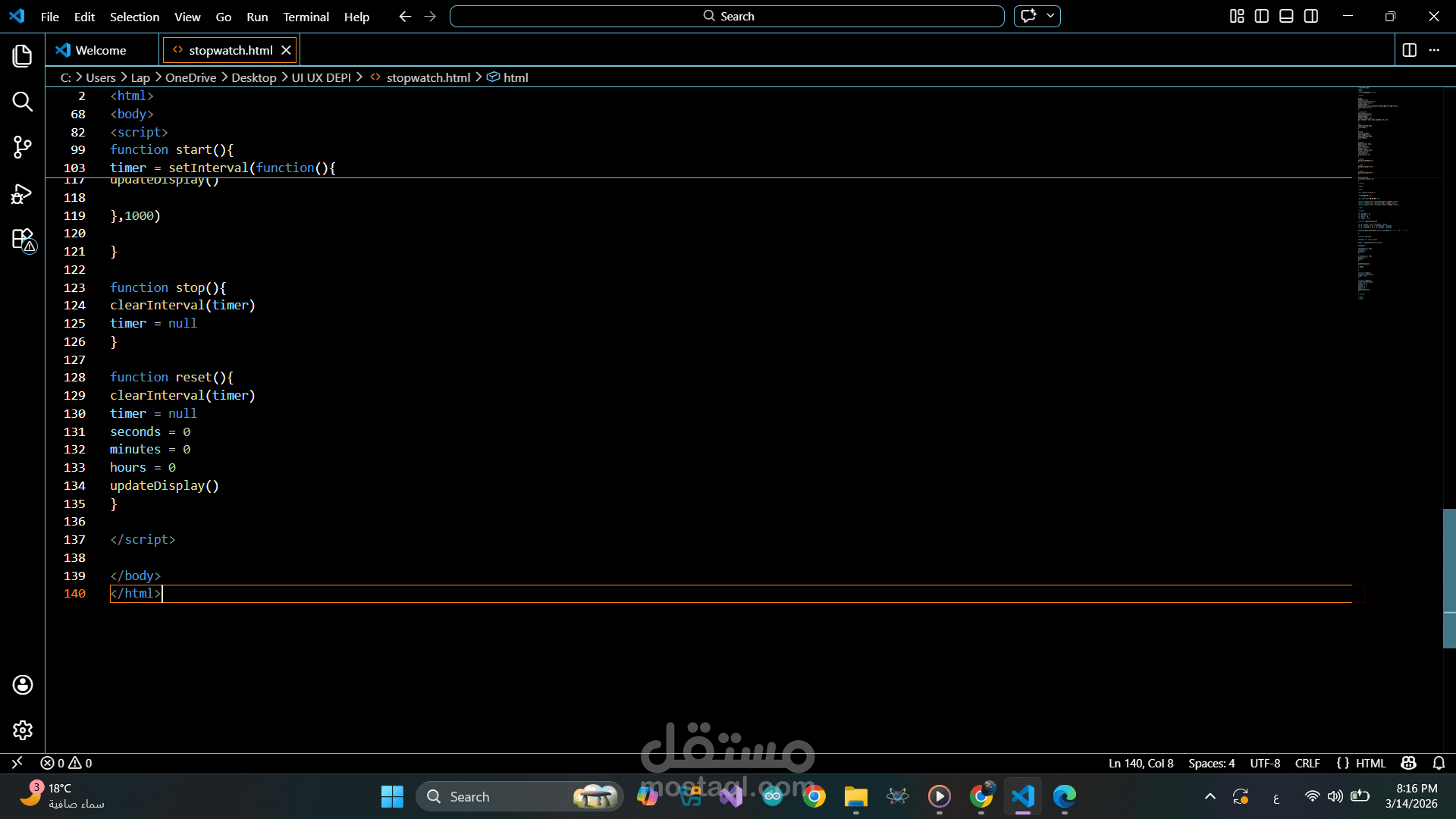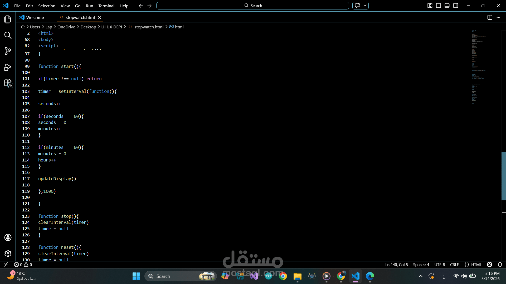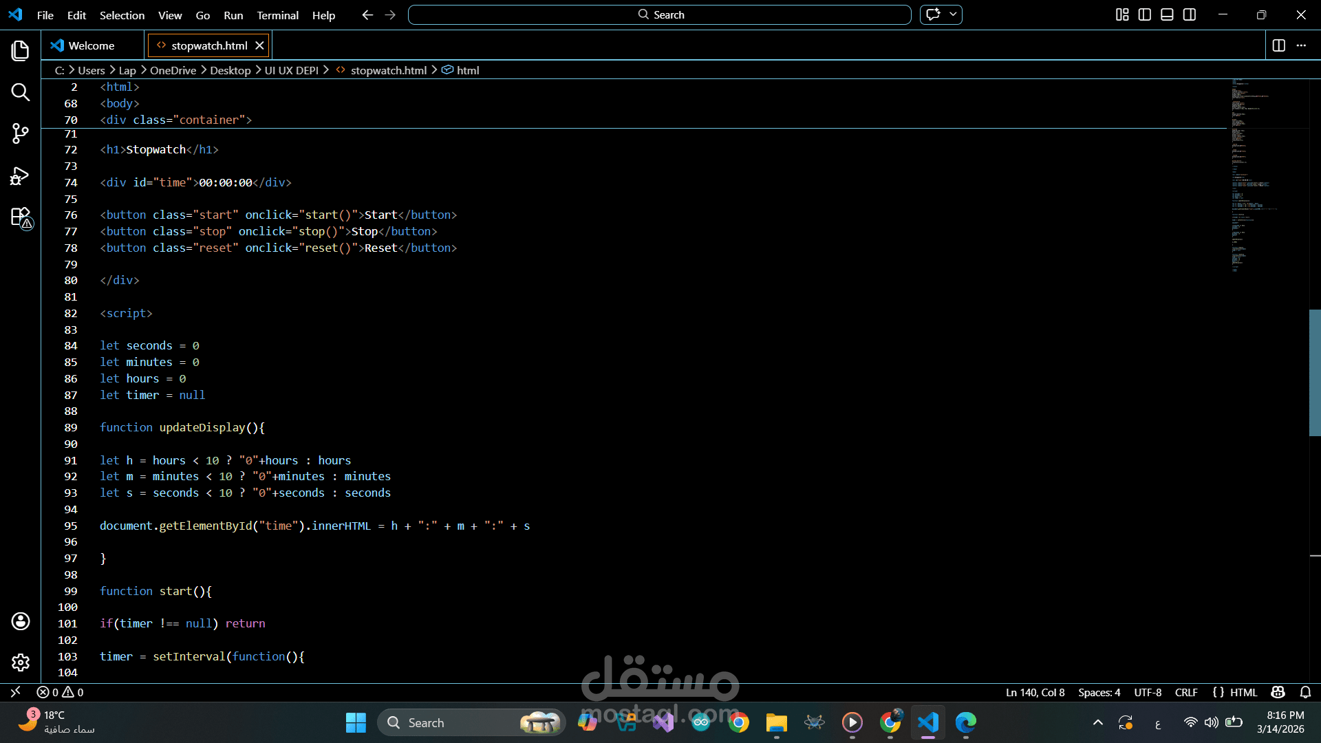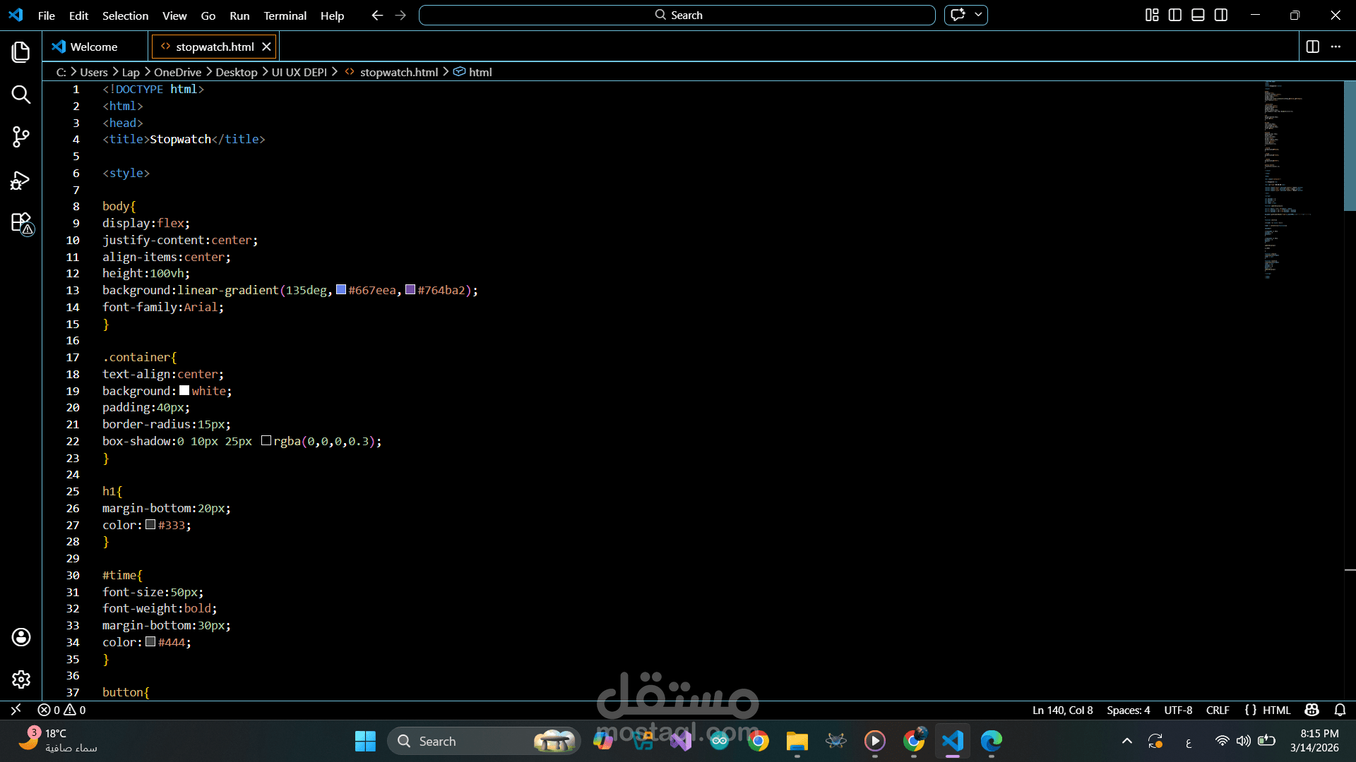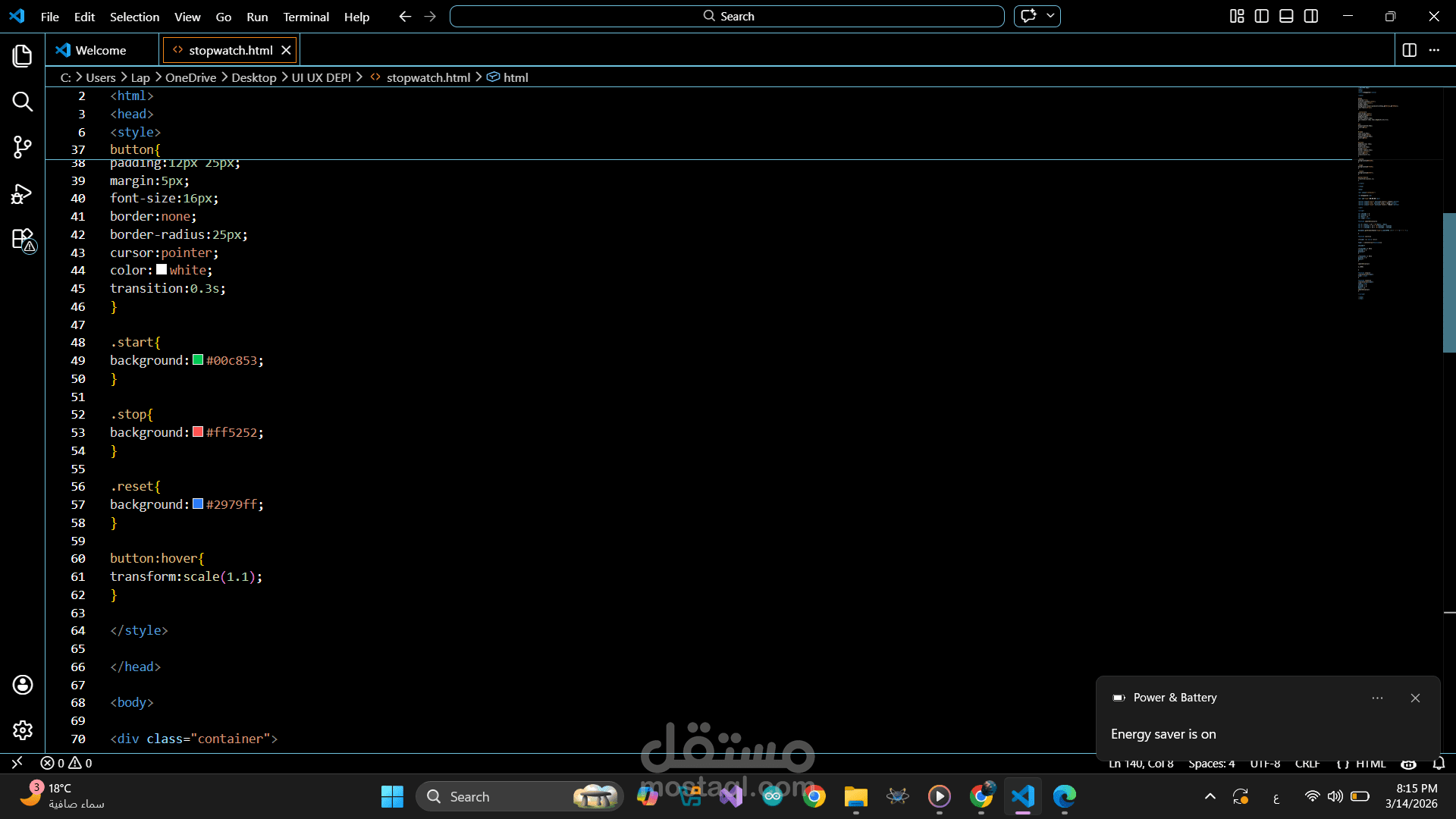 تصميم وتطوير ساعة إيقاف (Stopwatch) تفاعلية باستخدام HTML وCSS وJavaScript.