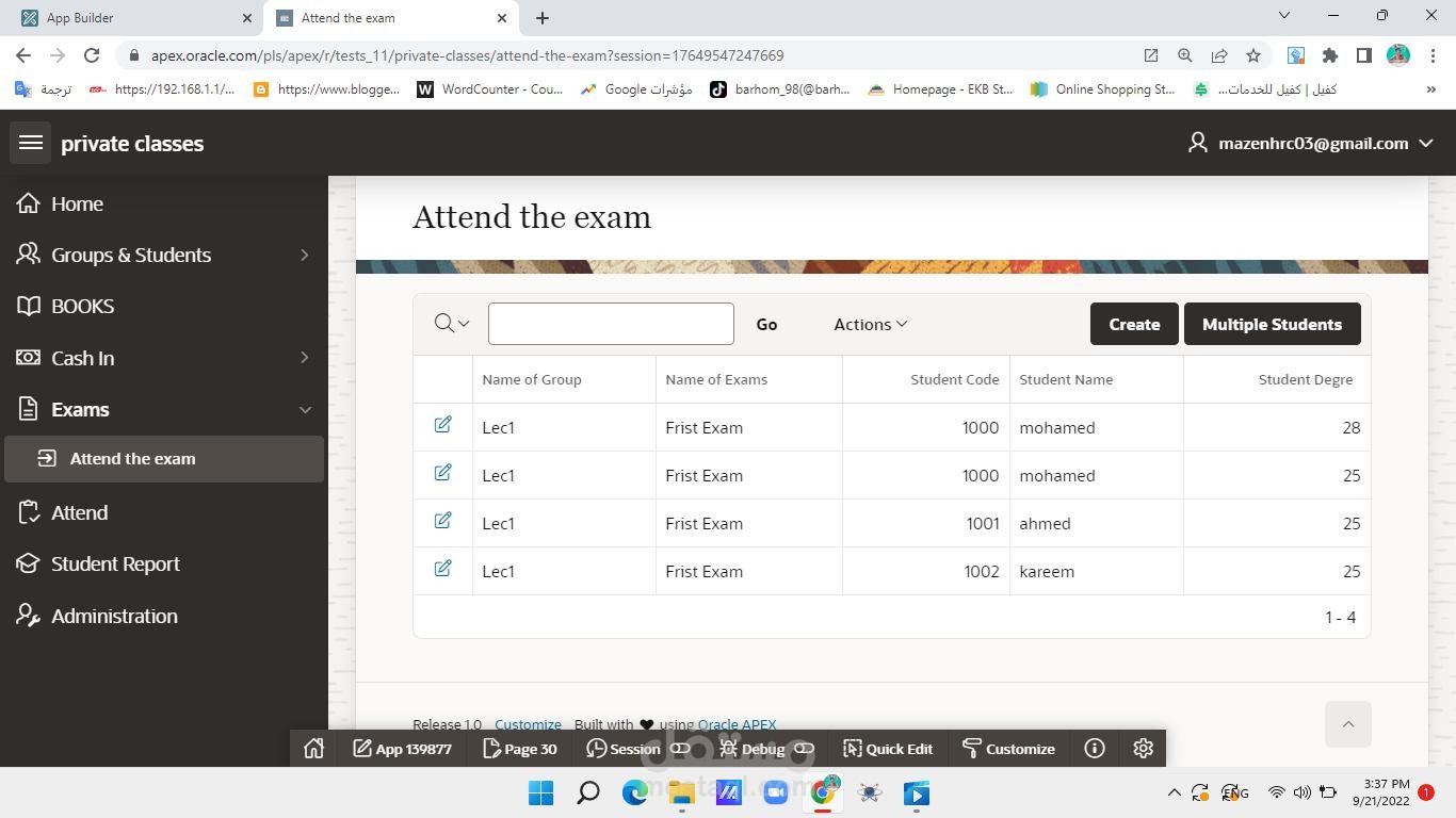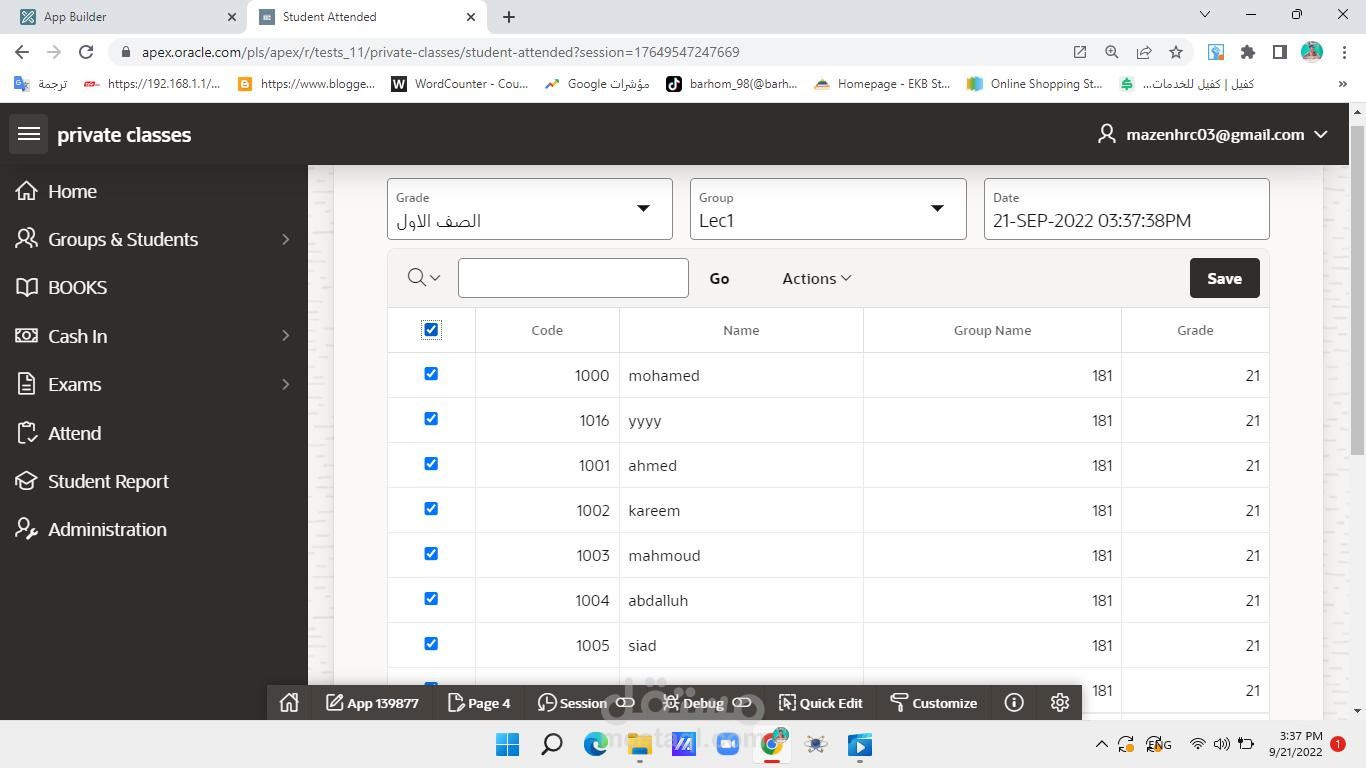 من هذه الصفحه يتم تسجيل حضور الامتحان لكل طالب