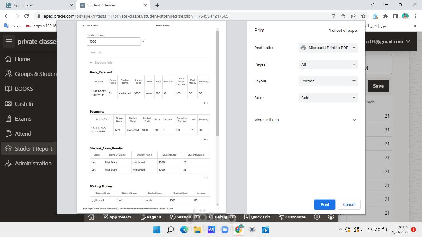 و من خلالص هذه الصفحه يتم انشاء تقرير لكل طالب