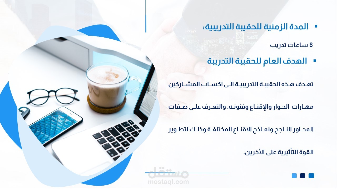 لقد نفذت عدت حقائب تدريبة وموضح عينة عمل عن حقيبة تدريبة عن مهارات الحوار لعدد 150 شريحة