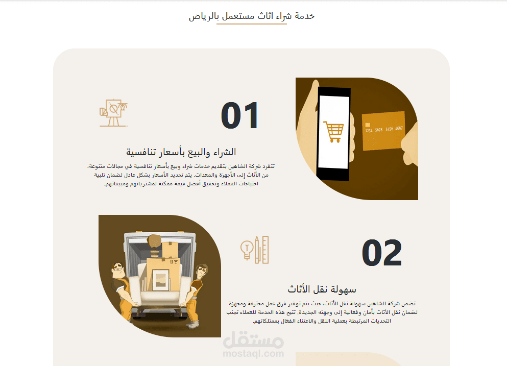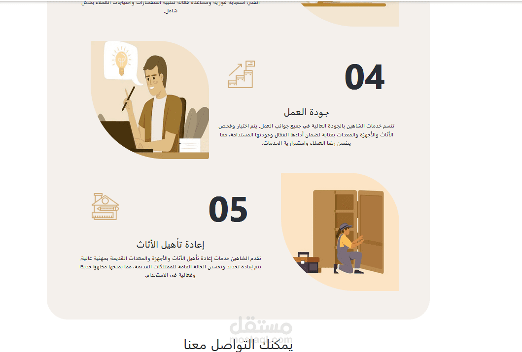 Services: صفحة تعرض الخدمات التي تقدمها الشركة مثل تصميم الأثاث حسب الطلب، التوصيل، والتركيب.