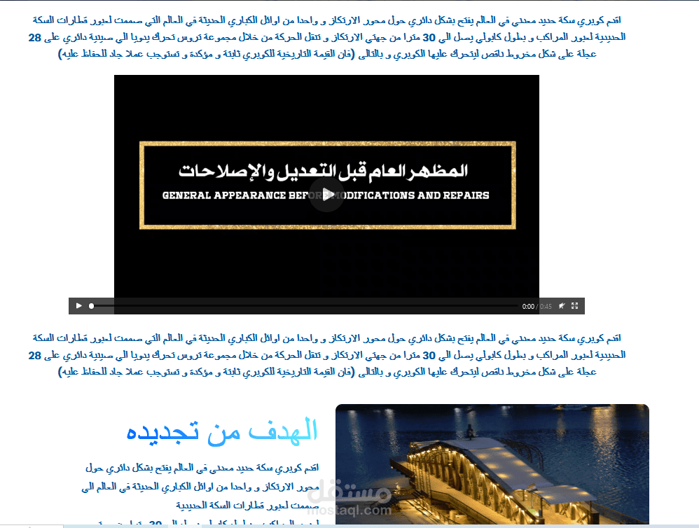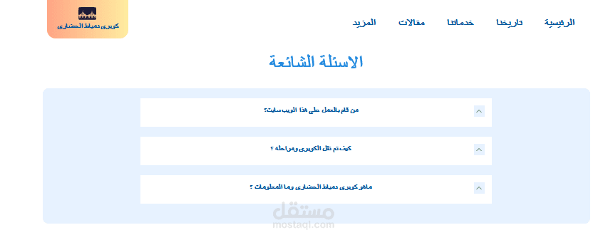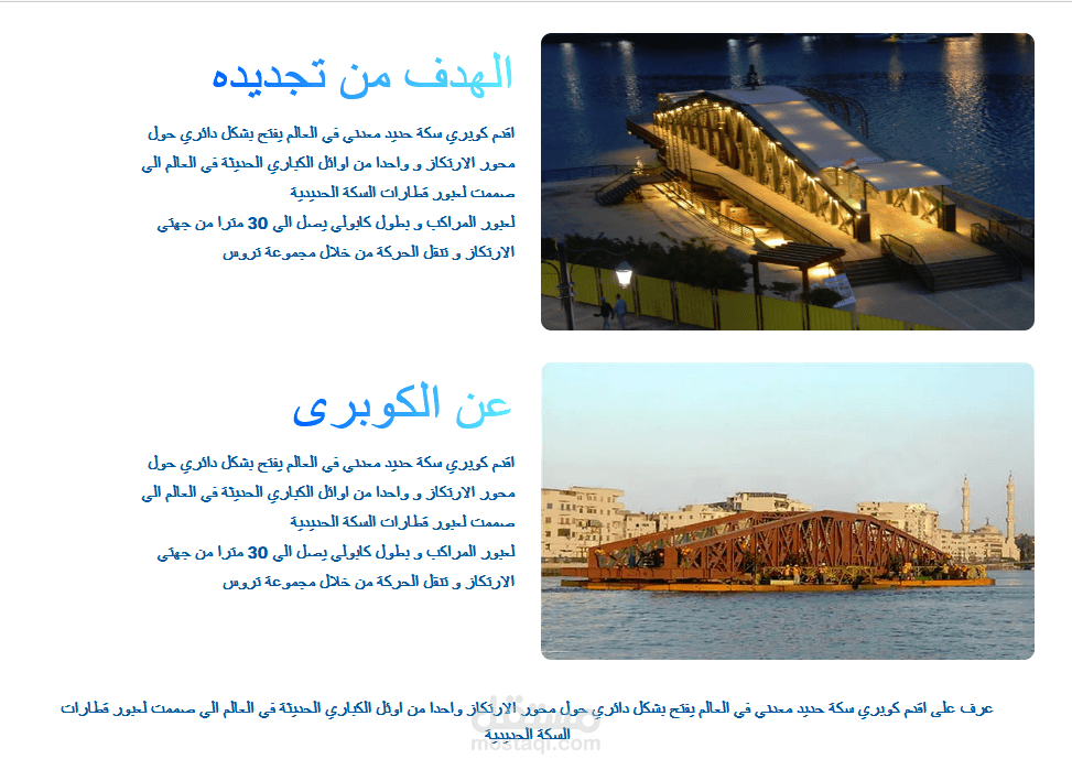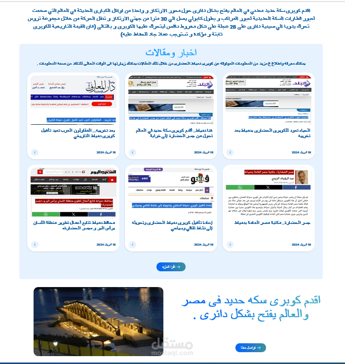 قمت بتطوير موقع ويب لمشروع حكومي مصري باسم "كوبري دمياط الحضاري". يهدف الموقع إلى تعريف المستخدمين بالخدمات التي يقدمها المشروع، مثل حجز القاعات والمؤتمرات. الموقع مبني باستخدام تقنيات حديثة لضمان أداء عالي وتجربة مستخدم ممتازة.