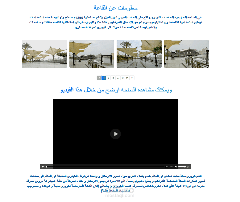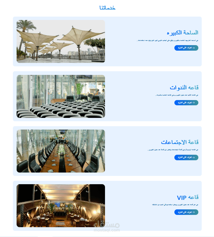 Services: صفحة تعرض الخدمات التي يقدمها المشروع مثل حجز القاعات والمؤتمرات، مع تفاصيل حول كل خدمة وكيفية الاستفادة منها.
