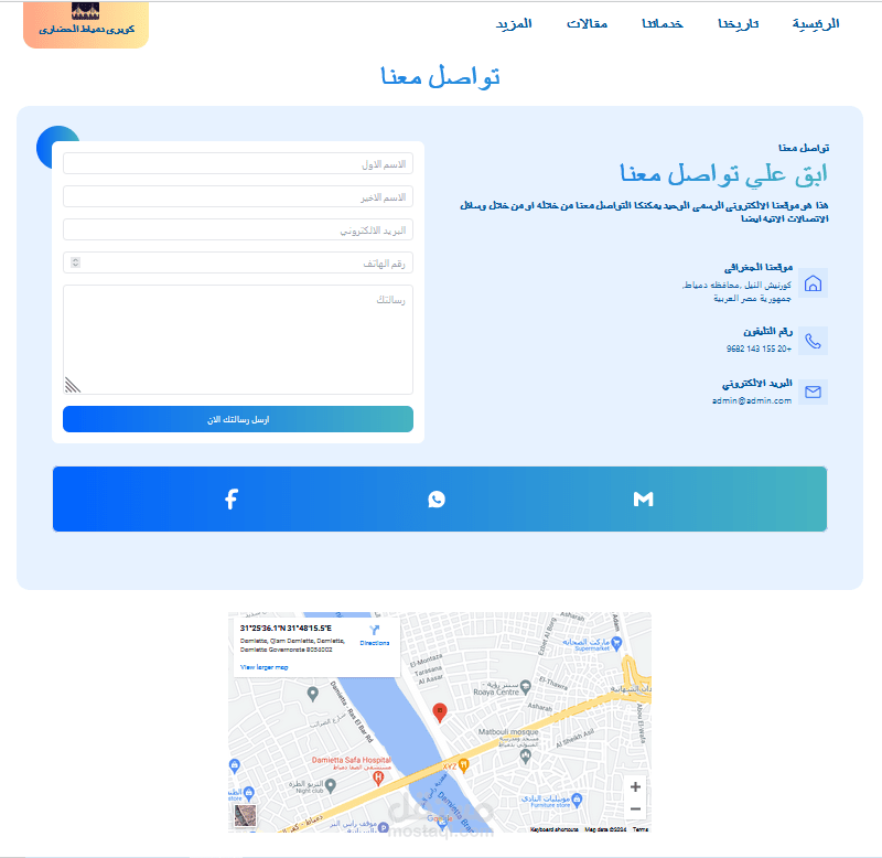 Contact: صفحة تحتوي على نموذج للتواصل مع إدارة المشروع، بالإضافة إلى معلومات الاتصال الضرورية.
