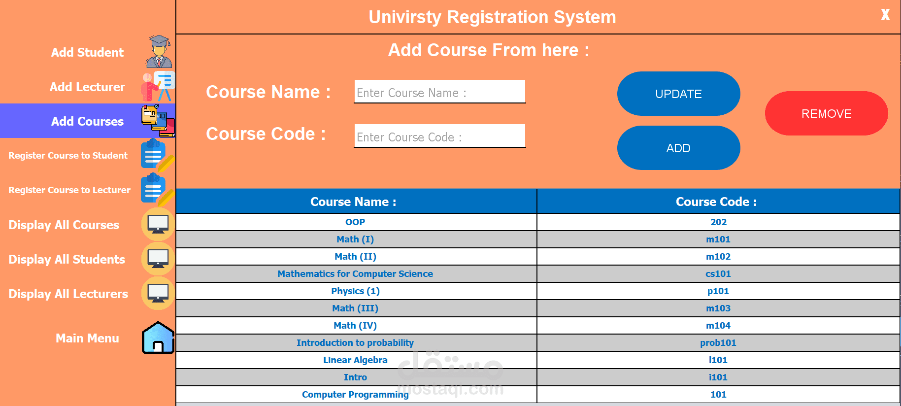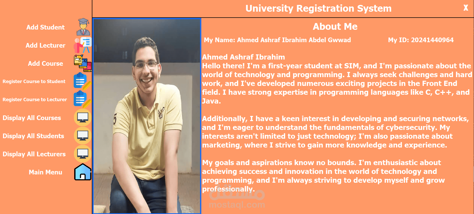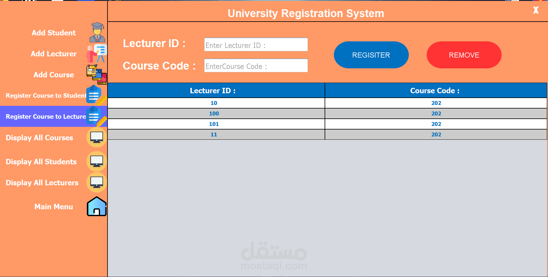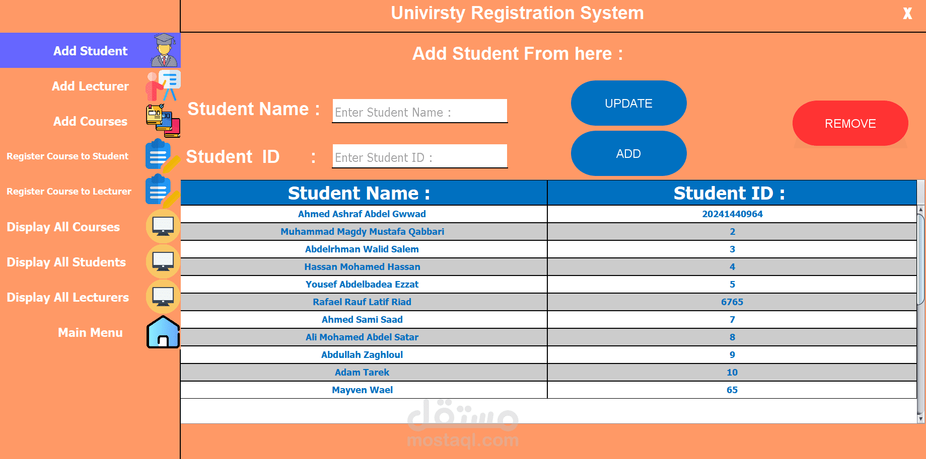 The University Registration System (URS) is a user-friendly platform developed using Java and Swing for the front-end and a database for data storage. It streamlines academic registration for students, faculty, and staff. Key features include adding and managing students, lecturers, and courses, as well as registering courses to students and lecturers. The interface offers easy navigation through options like displaying all courses, students, and lecturers. URS enhances efficiency, accessibility, and user experience, supporting the university’s administrative and educational needs.
