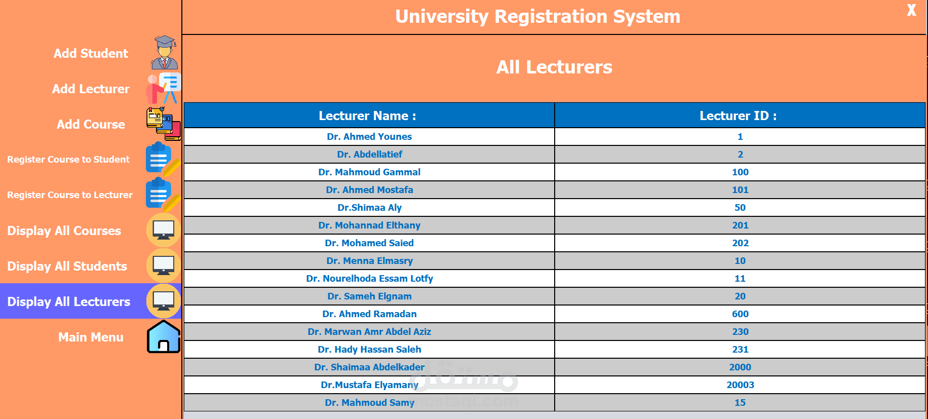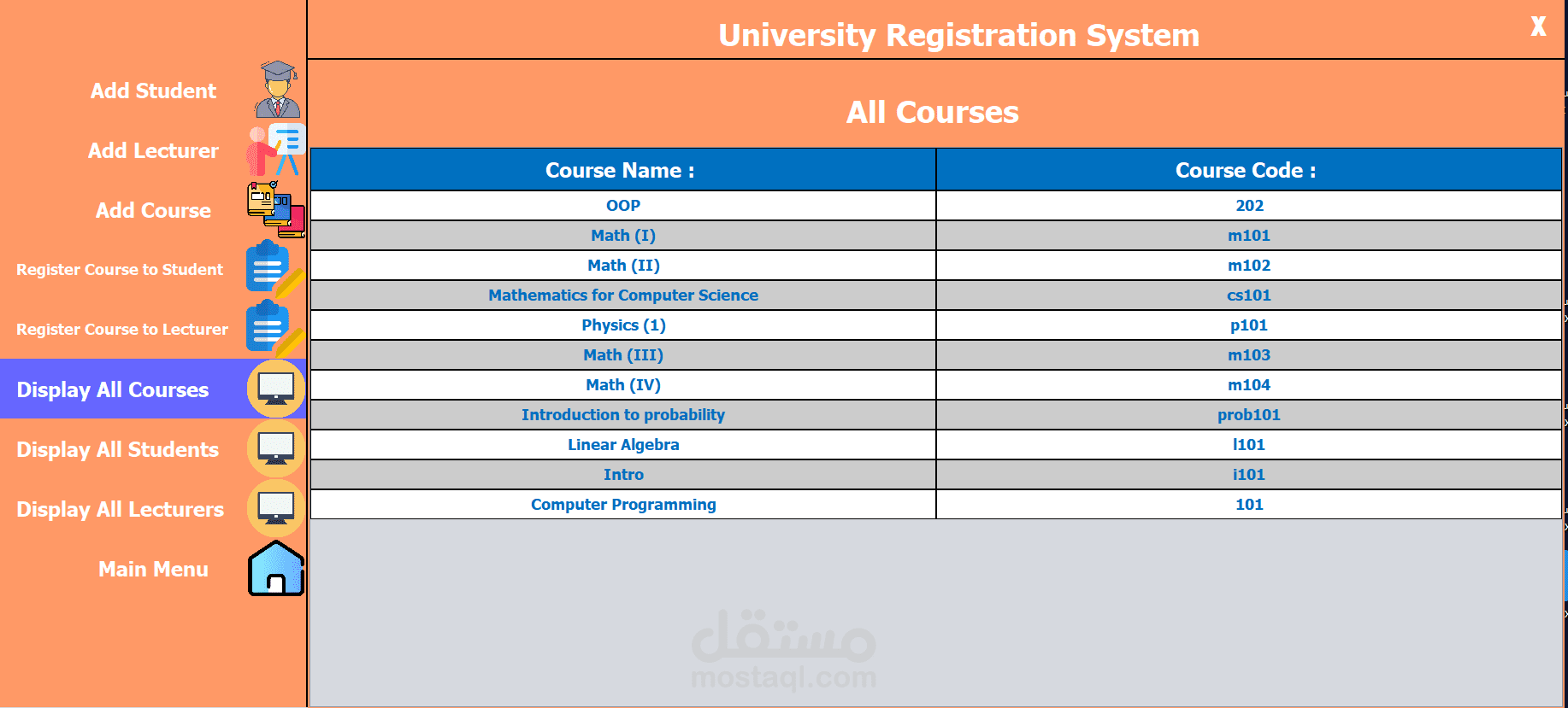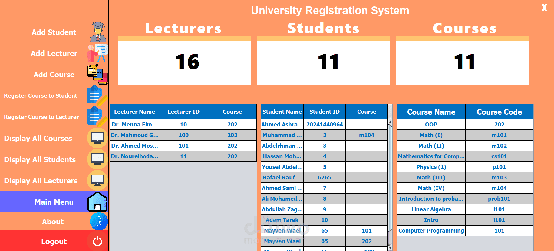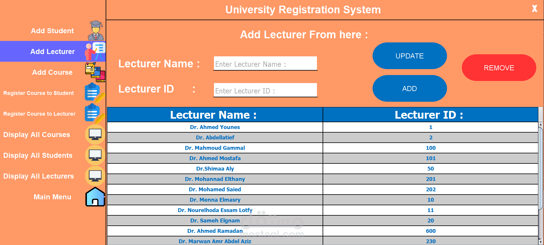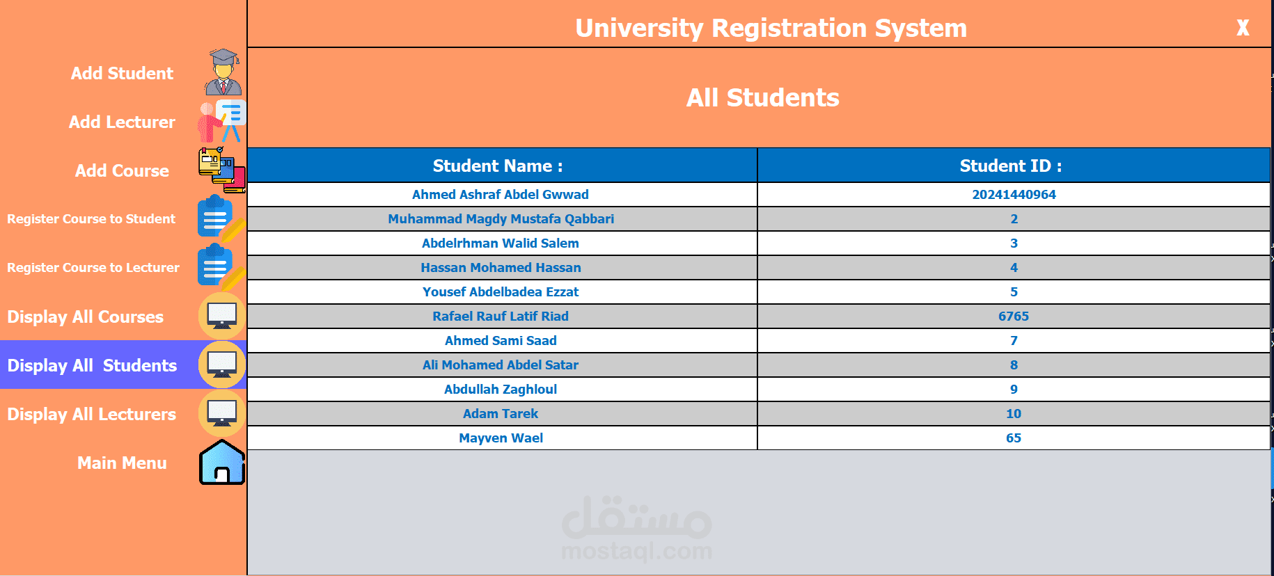 The University Registration System (URS) is a user-friendly platform developed using Java and Swing for the front-end and a database for data storage. It streamlines academic registration for students, faculty, and staff. Key features include adding and managing students, lecturers, and courses, as well as registering courses to students and lecturers. The interface offers easy navigation through options like displaying all courses, students, and lecturers. URS enhances efficiency, accessibility, and user experience, supporting the university’s administrative and educational needs.