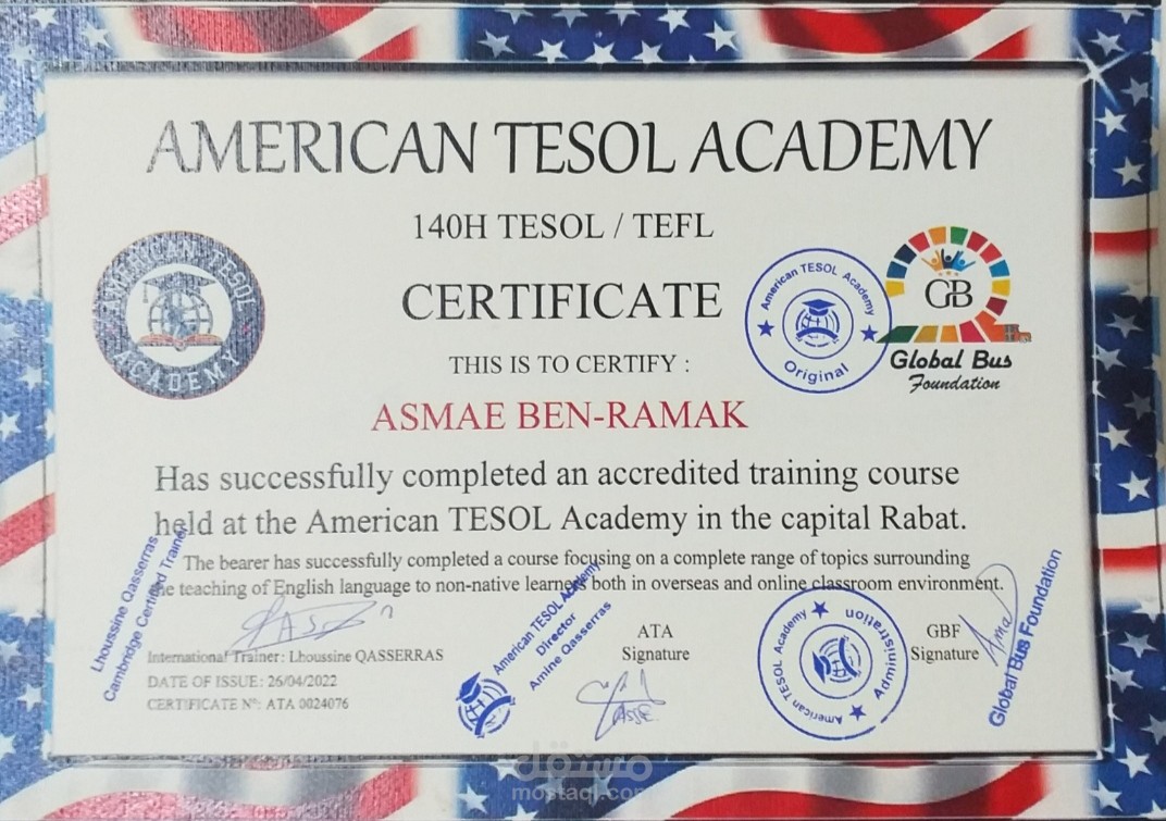 يسعدني أن أقدم خدماتي المتخصصة في تدريس اللغة الإنجليزية كلغة ثانية عن بُعد. بفضل حصولي على شهادتي TESOL من المعهد الأمريكي للتدريس الدولي، أتمتع بمعرفة عميقة وخبرة واسعة في تصميم وتقديم دروس فعّالة تلبي احتياجات كل متعلم.