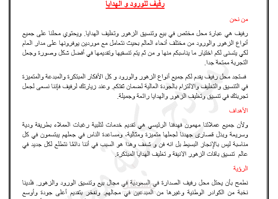 كتابة المحتوى هيا اولى اعمالي في مشروع مستقل لمتجر بيع الورود و كتابة ملف كامل عن المتجر و كتابة و وصف كل شي يخص المتجر من العناوين التالية ( من نحن، الأهداف، الرؤية، المهمة، لماذا نحن، الخدمات و المنتجات، التواصل )