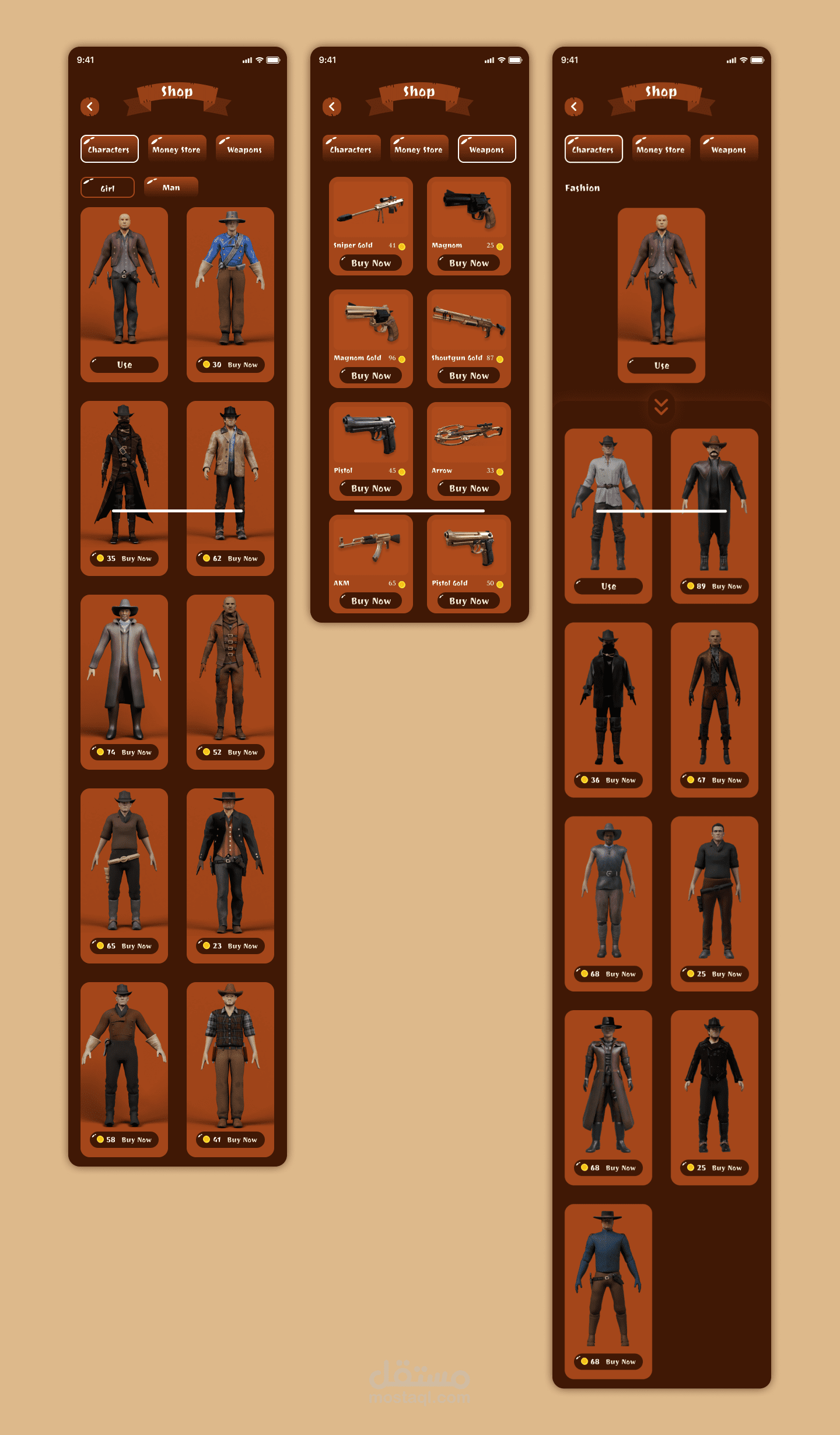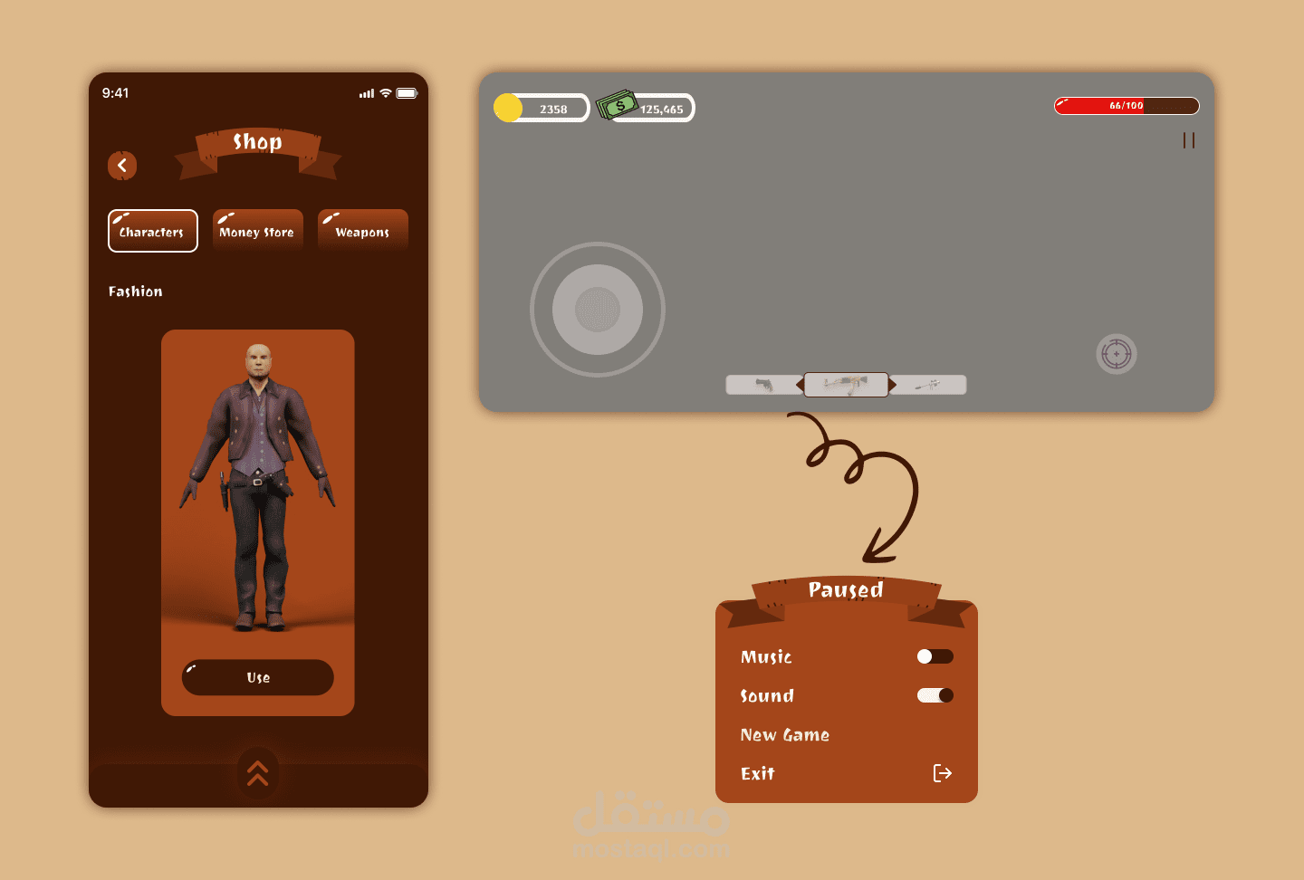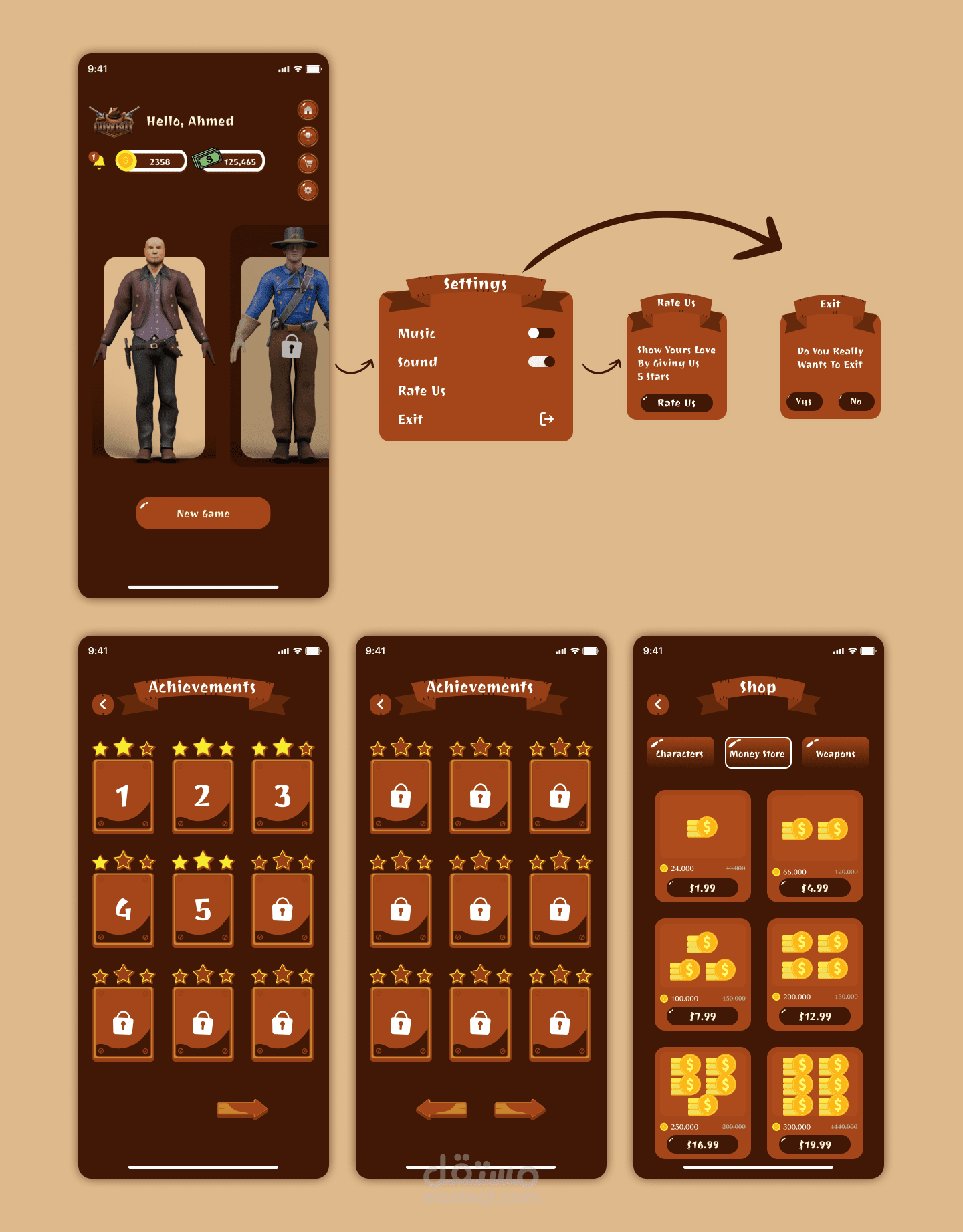 - **تصميم رسومي جذاب**: قمت بإنشاء تصميمات واجهة مستخدم تتميز برسومات كرتونية تعكس طابع الغرب الأمريكي وتناسب فئة اللاعبين المستهدفة.